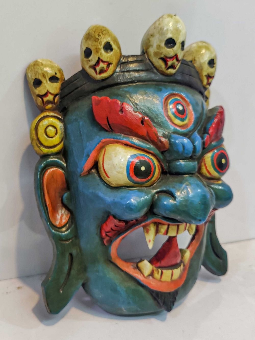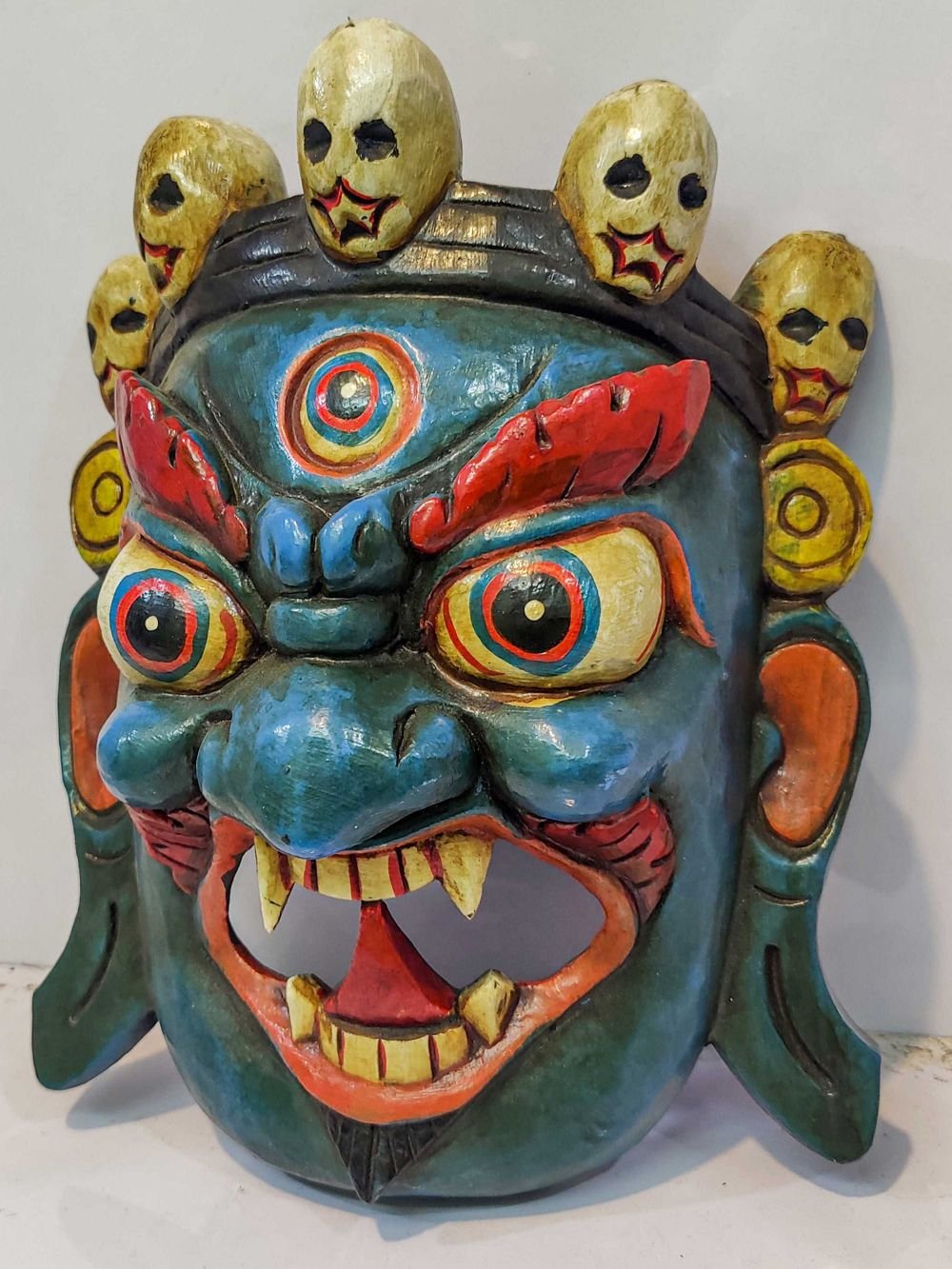 Bhairav, Handmade Wooden Mask, Wall Hanging, Painted Blue, Poplar Wood, Mahakala Two Arms , Fierce protector, destroys obstacles, guards the Dharma