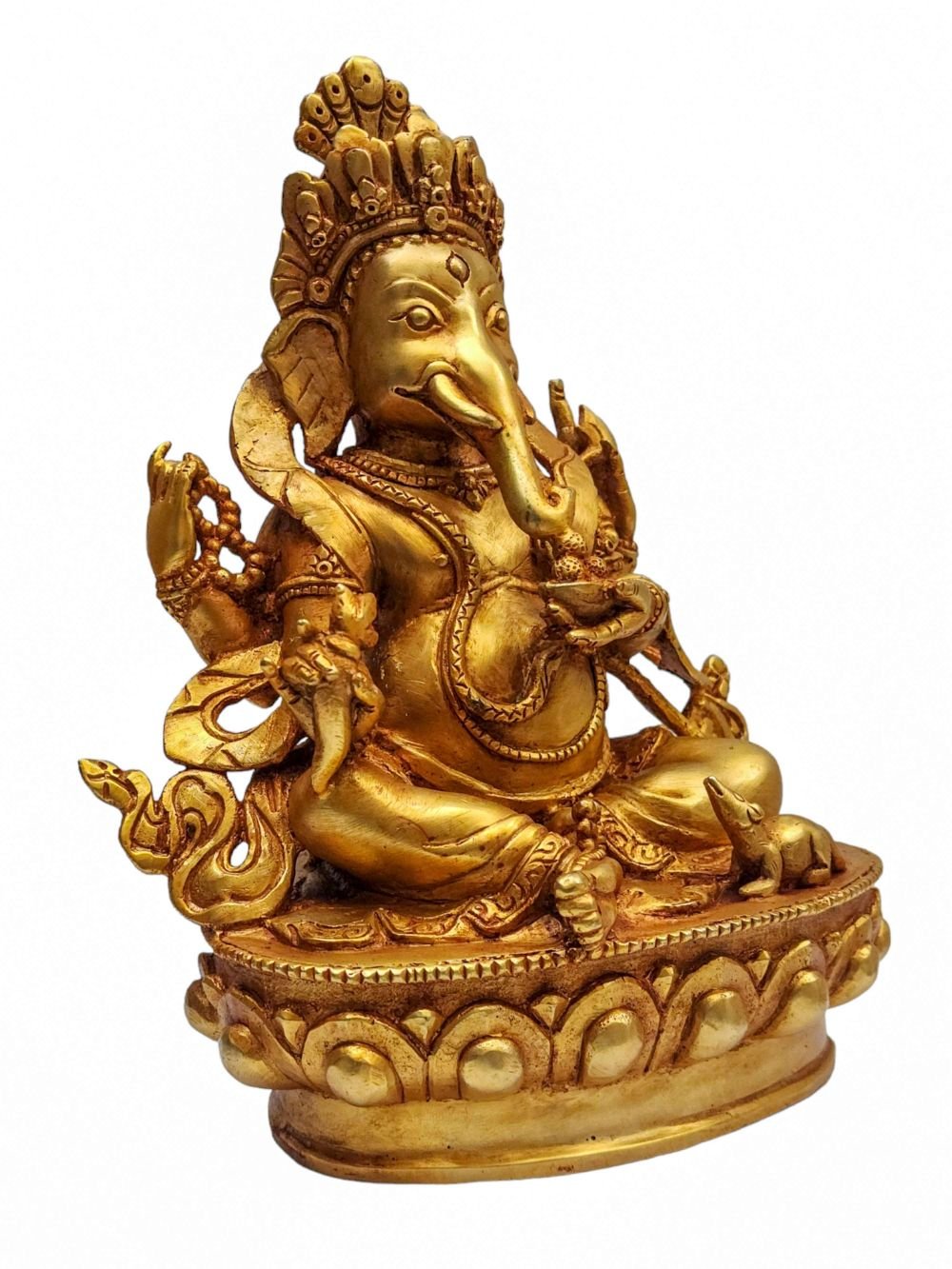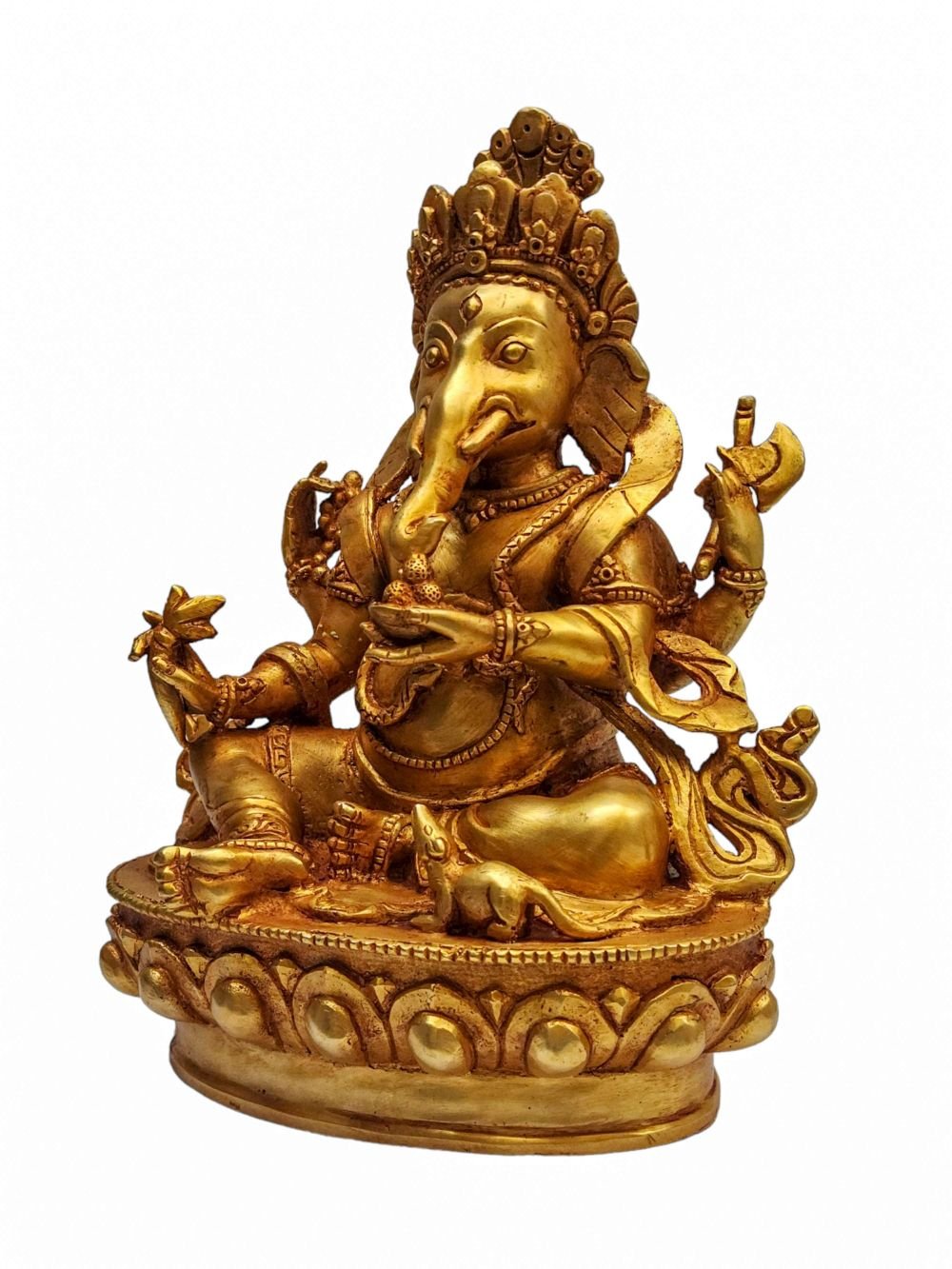 This Ganesh is finished with full gold plating. also known as mercury gold plating or fire gold plating. This traditional technique involves the application of a genuine layer of gold onto the Ganesh. Referred to as mercury gold plating, it is considered the correct and authentic form of gold plating in Nepal. Despite being more expensive than electroplating, this traditional mercury gold plating is gaining popularity again in Nepal. People are drawn to its authenticity, longevity, and the unmatched beauty it brings to the Ganesh. The resurgence of interest in this traditional form of gold plating reflects a growing appreciation for the craftsmanship and cultural heritage of Nepal Read More
