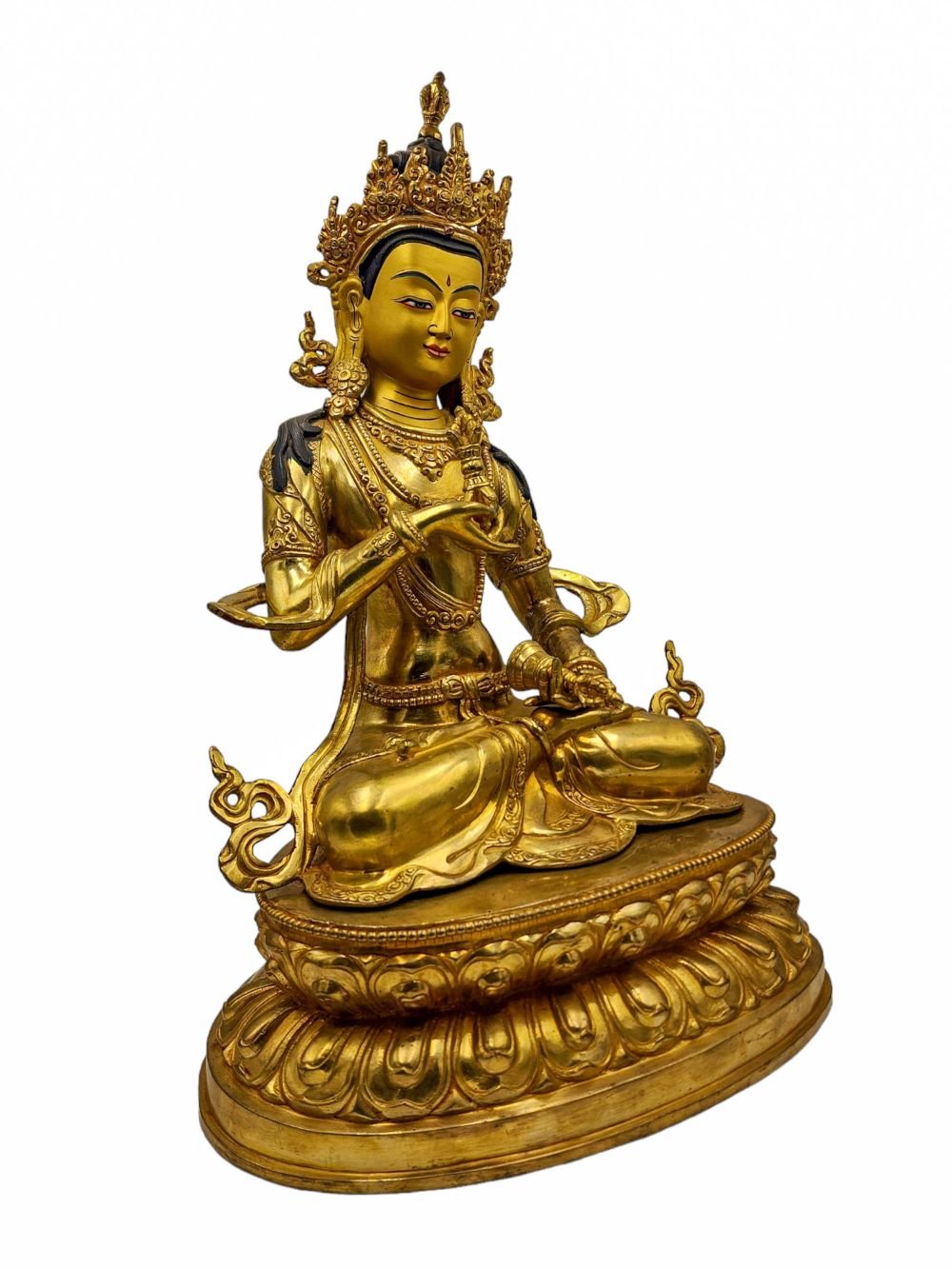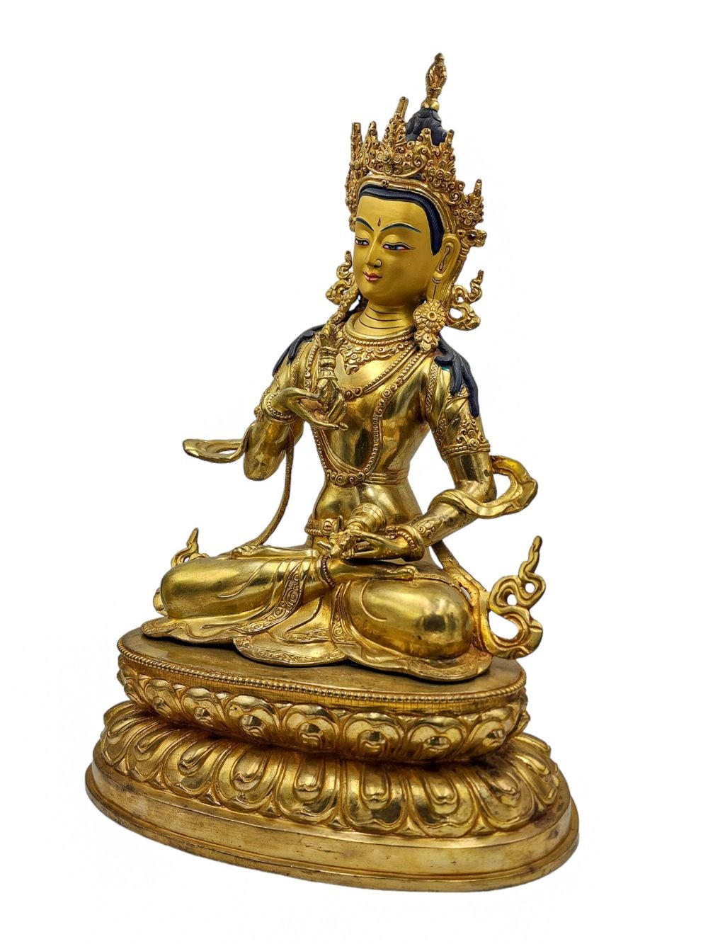 The face of Vajrasattva is painted with gold to enhance its significant features, particularly the eyes, and lips. This detailed painting is essential as it brings forth the crucial attributes of the expression of eyes and lips that metal carving alone cannot capture.