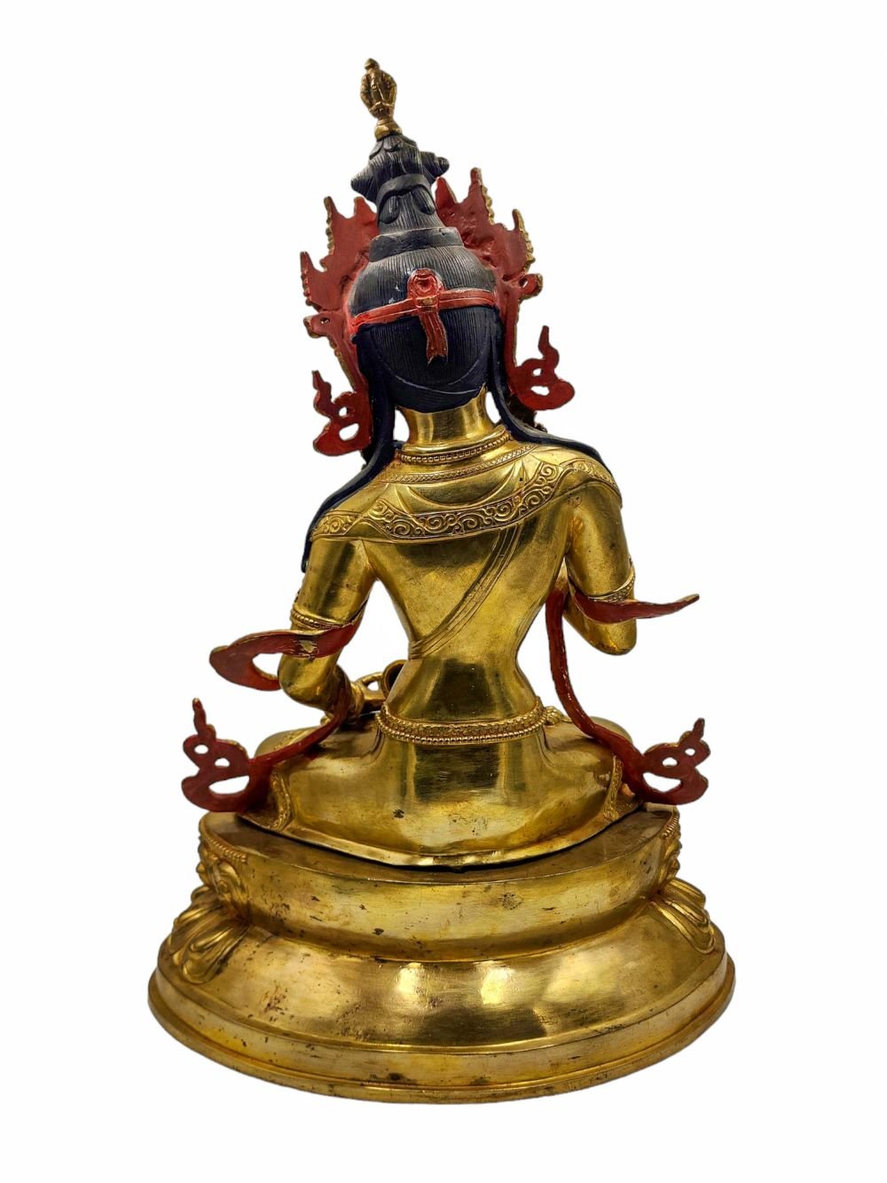 This Vajrasattva is finished with full gold plating. also known as mercury gold plating or fire gold plating. This traditional technique involves the application of a genuine layer of gold onto the Vajrasattva. Referred to as mercury gold plating, it is considered the correct and authentic form of gold plating in Nepal. Despite being more expensive than electroplating, this traditional mercury gold plating is gaining popularity again in Nepal. People are drawn to its authenticity, longevity, and the unmatched beauty it brings to the Vajrasattva. The resurgence of interest in this traditional form of gold plating reflects a growing appreciation for the craftsmanship and cultural heritage of Nepal Read More