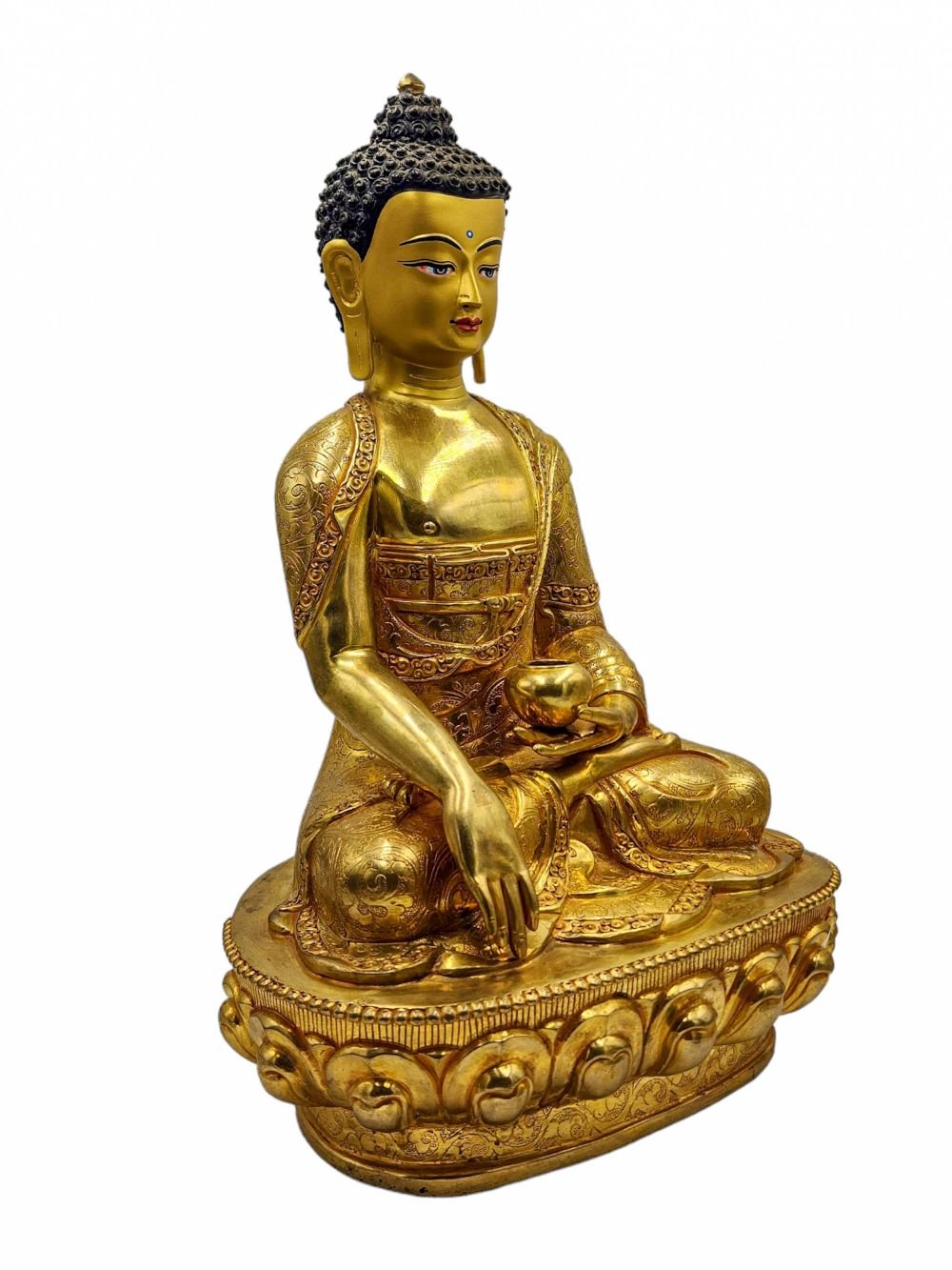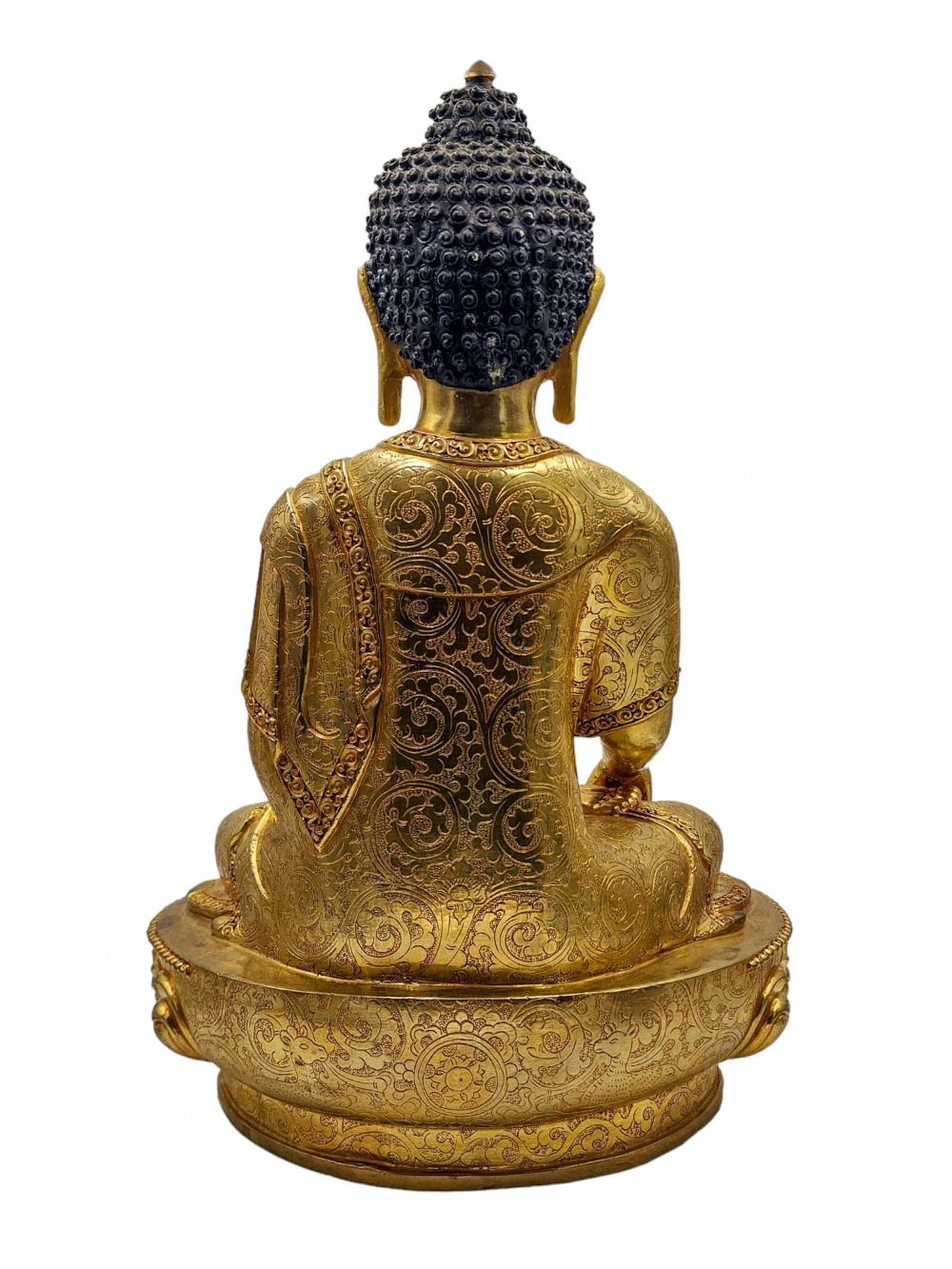This Shakyamuni Buddha is finished with full gold plating. also known as mercury gold plating or fire gold plating. This traditional technique involves the application of a genuine layer of gold onto the Shakyamuni Buddha. Referred to as mercury gold plating, it is considered the correct and authentic form of gold plating in Nepal. Despite being more expensive than electroplating, this traditional mercury gold plating is gaining popularity again in Nepal. People are drawn to its authenticity, longevity, and the unmatched beauty it brings to the Shakyamuni Buddha. The resurgence of interest in this traditional form of gold plating reflects a growing appreciation for the craftsmanship and cultural heritage of Nepal Read More