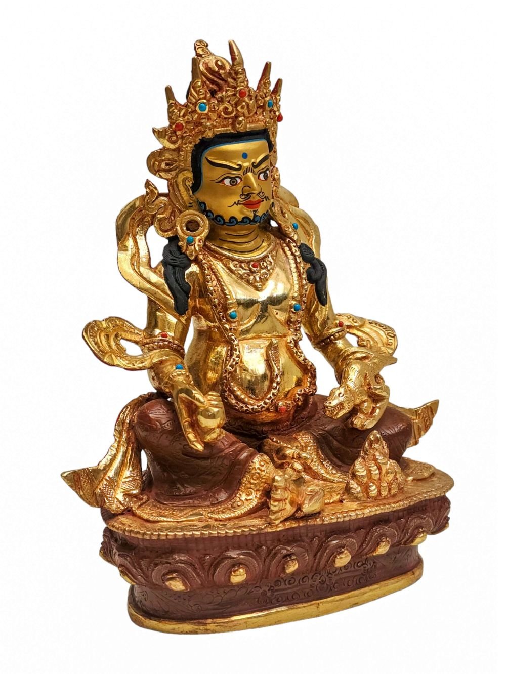 This Yellow Jambhala has a Partly gold-plated finish. Partly fire gold gilding, a common practice in Nepali handicrafts. This technique is skillfully employed by artisans to create intricate designs on various metal objects, including statues, jewelry, and decorative items. Through a process, a mask or resist is applied to safeguard specific areas from the gold plating. The object is then subjected to high temperatures, allowing the gold to beautifully adhere to exposed surfaces using a combination of heat and pressure.