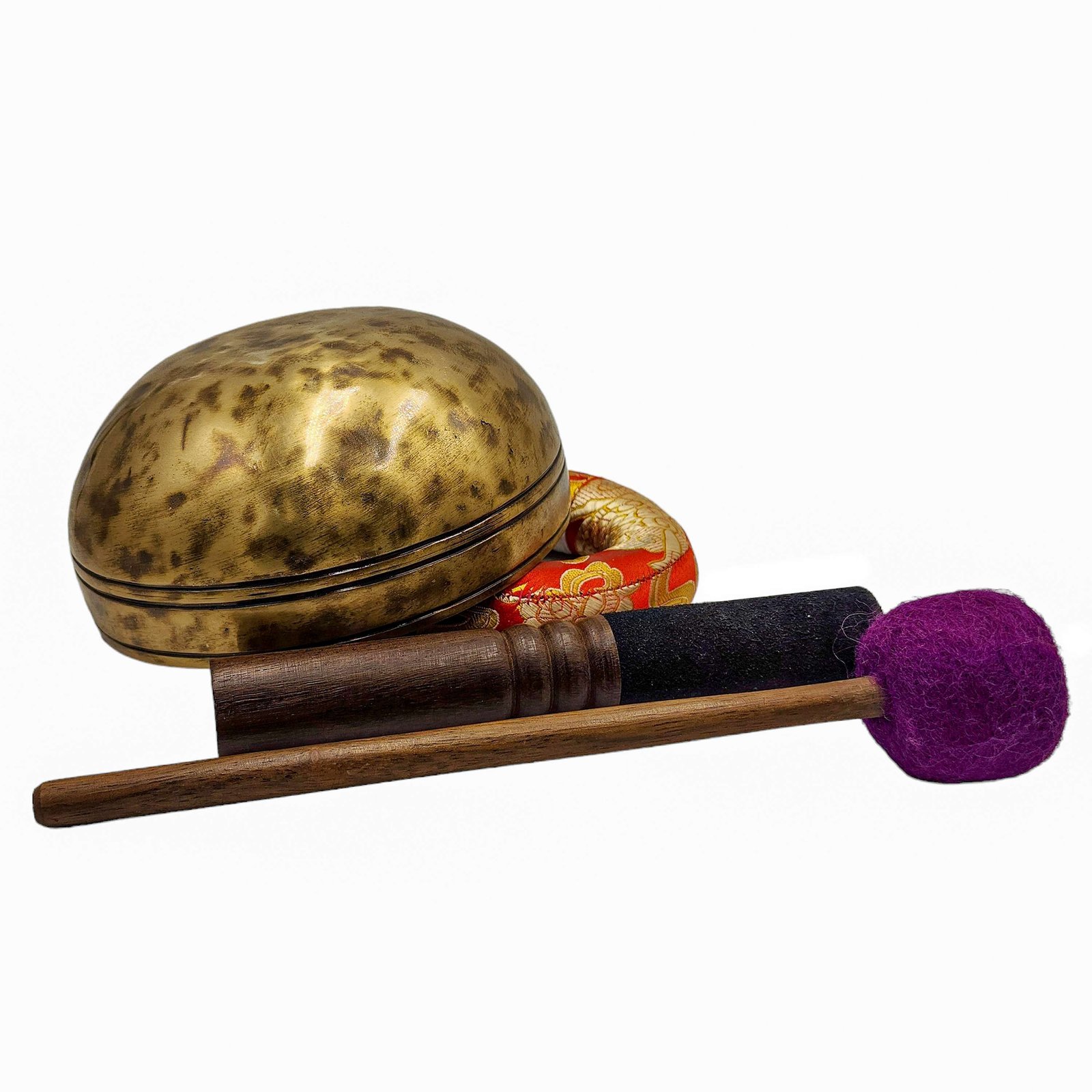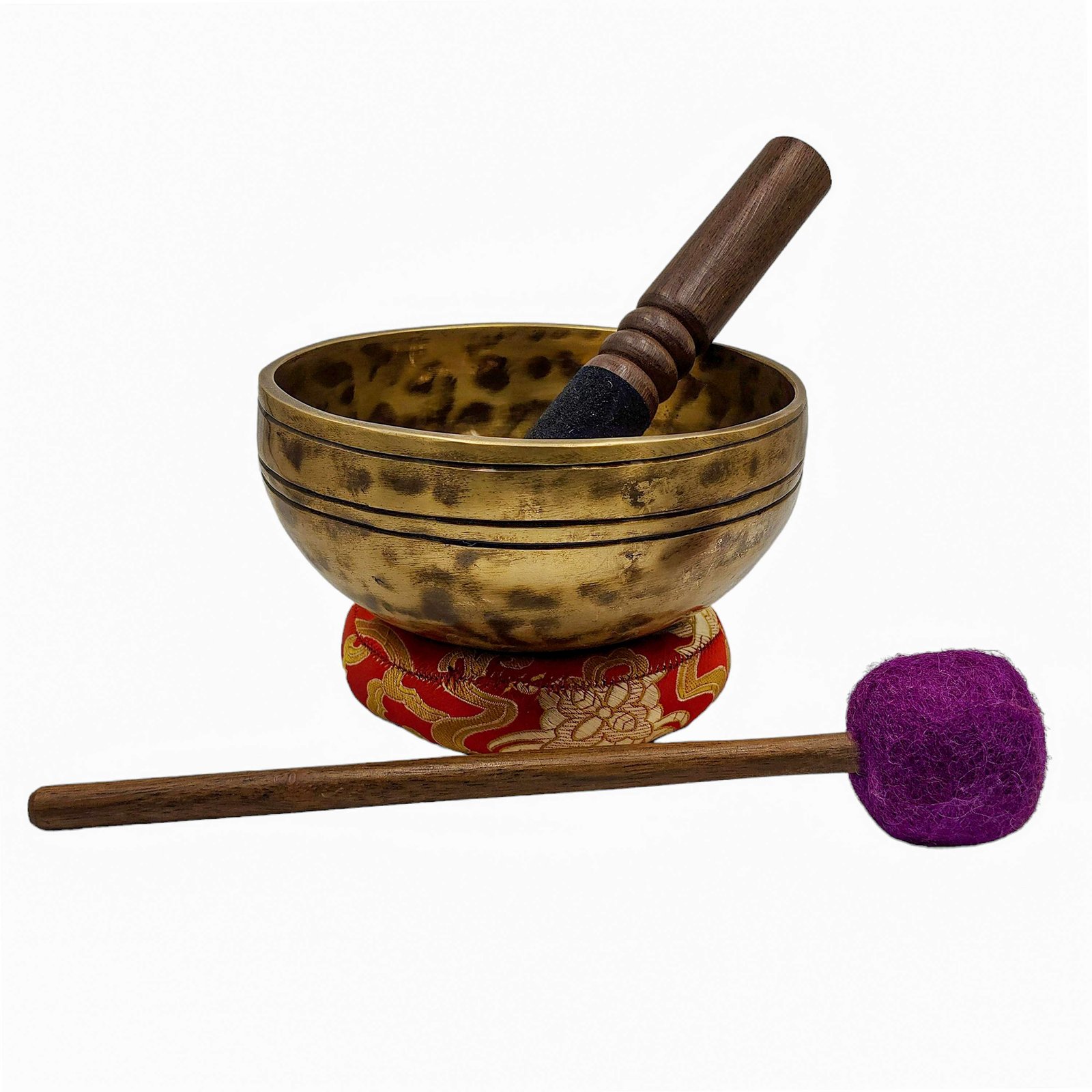 The Jambati Singing Bowl you are purchasing includes a cushion, a wooden playing mallet, and a felt-hitting mallet for playing the bowl. If you require additional accessories, you can browse the options above and purchase them separately. Should you have any further questions or need assistance, please don't hesitate to let us know. Read More
