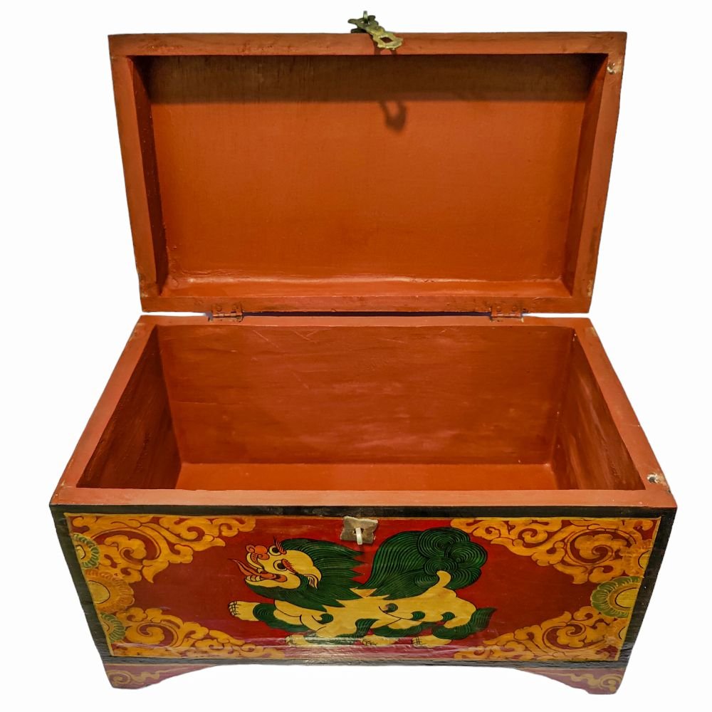 A Tibetan wooden box is a handcrafted storage container made from wood and often adorned with intricate Tibetan motifs and vibrant colors. These boxes are typically crafted by skilled artisans using traditional techniques passed down through generations. The decorations on the box usually include symbols of good fortune, such as lotus flowers, endless knots, dragons, or mythical creatures, and are painted in vivid hues like red, blue, green, and gold. These motifs not only add to the aesthetic appeal but also carry significant cultural and spiritual meanings in Tibetan Buddhism. Read More