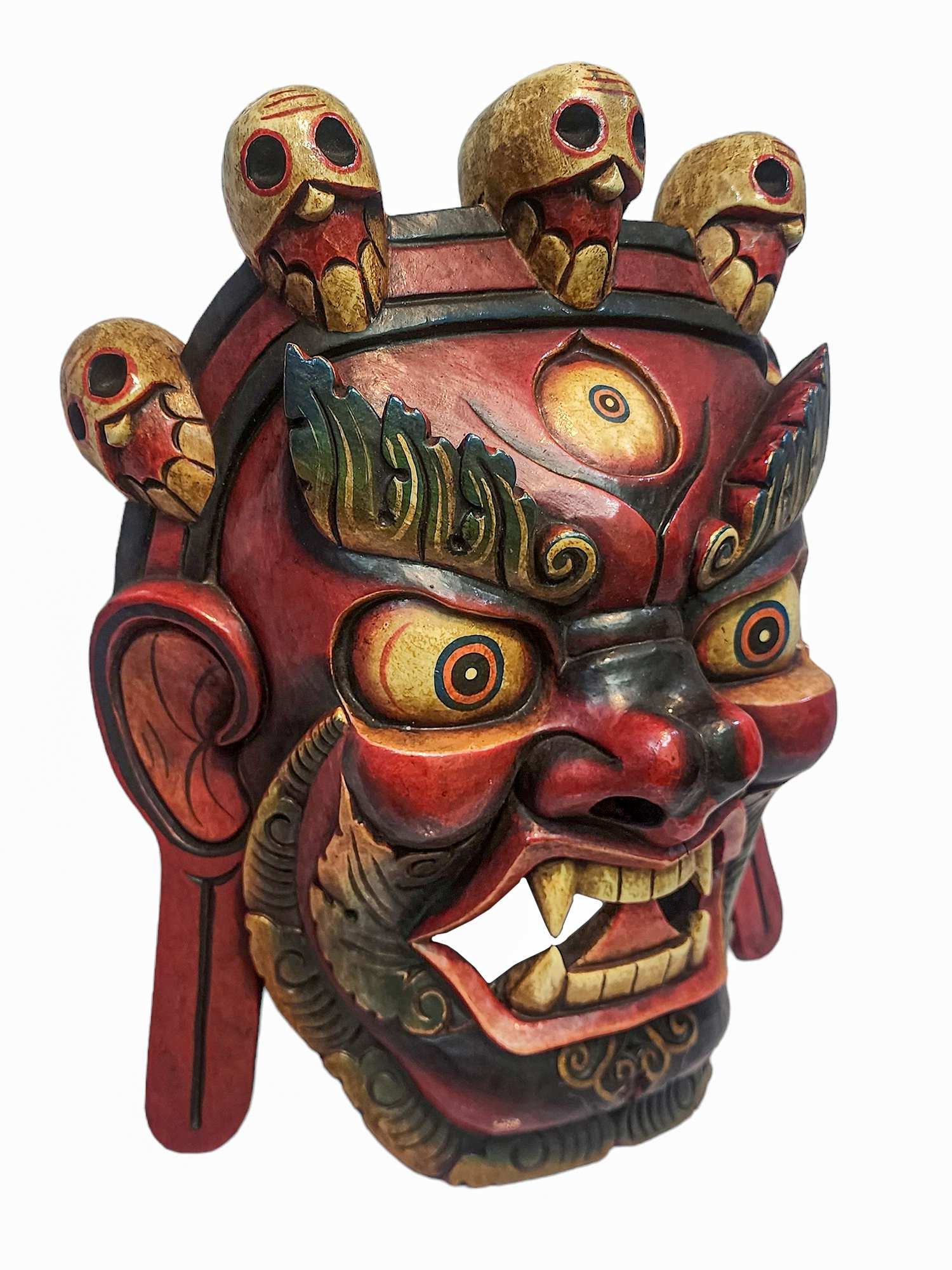 Bhairav, Handmade Wooden Mask, Wall Hanging, Painted Red, Poplar Wood, Mahakala Two Arms , Fierce protector, destroys obstacles, guards the Dharma