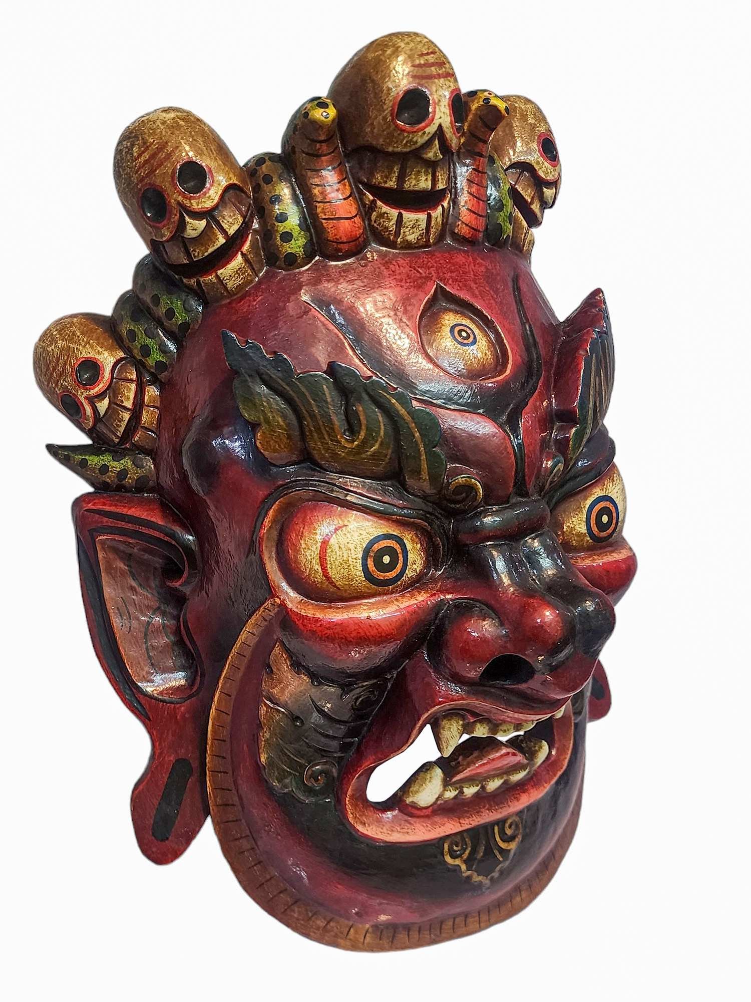 Bhairav, Handmade Wooden Mask, Wall Hanging, Painted Red, Poplar Wood, Mahakala Two Arms |