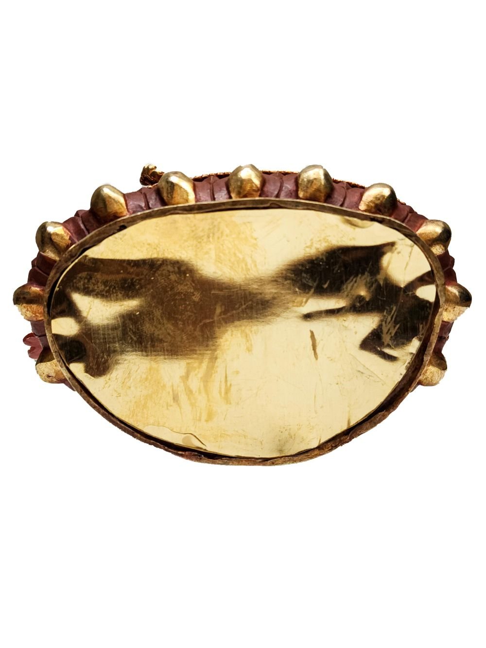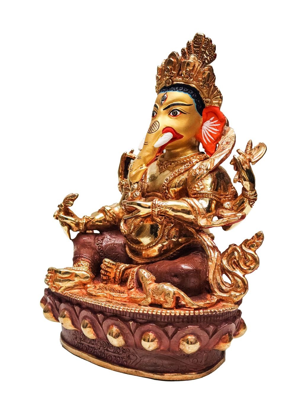 The face of Ganesh is painted with gold to enhance its significant features, particularly the eyes, and lips. This detailed painting is essential as it brings forth the crucial attributes of the expression of eyes and lips that metal carving alone cannot capture.