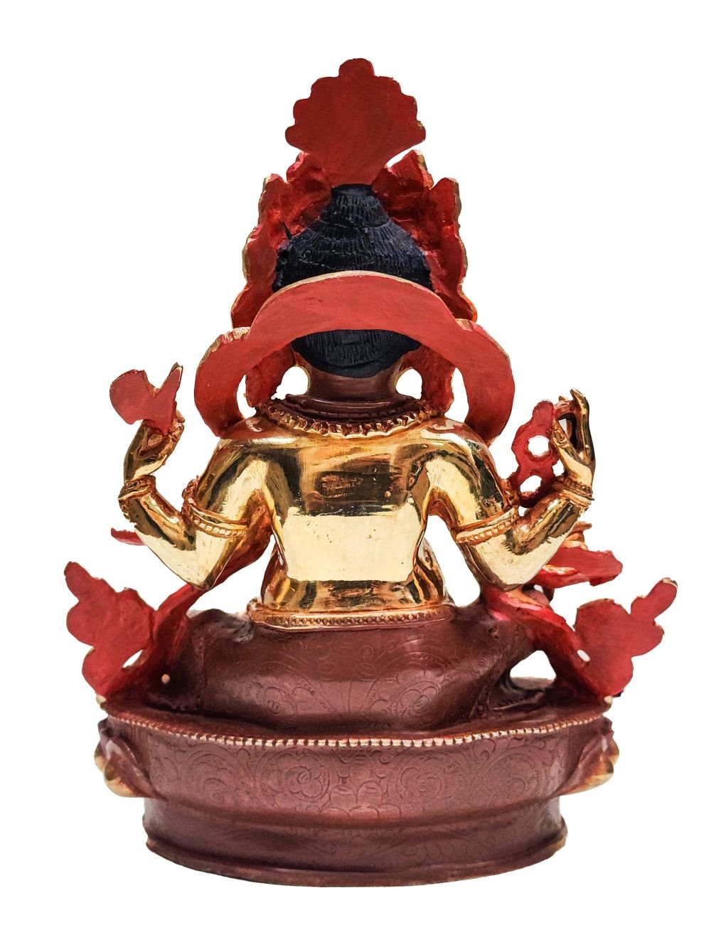 This Ganesh has a Partly gold-plated finish. Partly fire gold gilding, a common practice in Nepali handicrafts. This technique is skillfully employed by artisans to create intricate designs on various metal objects, including statues, jewelry, and decorative items. Through a process, a mask or resist is applied to safeguard specific areas from the gold plating. The object is then subjected to high temperatures, allowing the gold to beautifully adhere to exposed surfaces using a combination of heat and pressure.