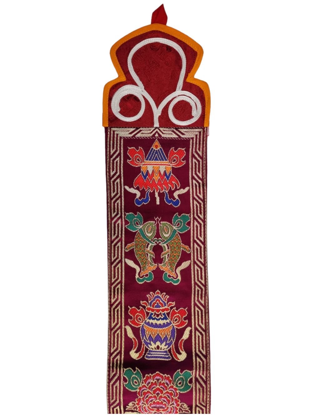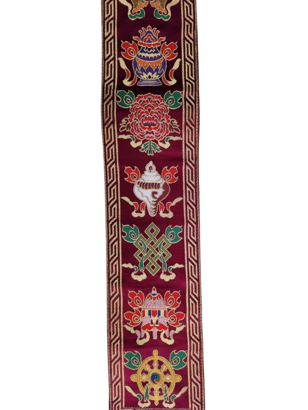 Tibetan Cochin Brocade Wall Hanging with Embroidered Ashtamangala, Color , representing prosperity and divine protection
