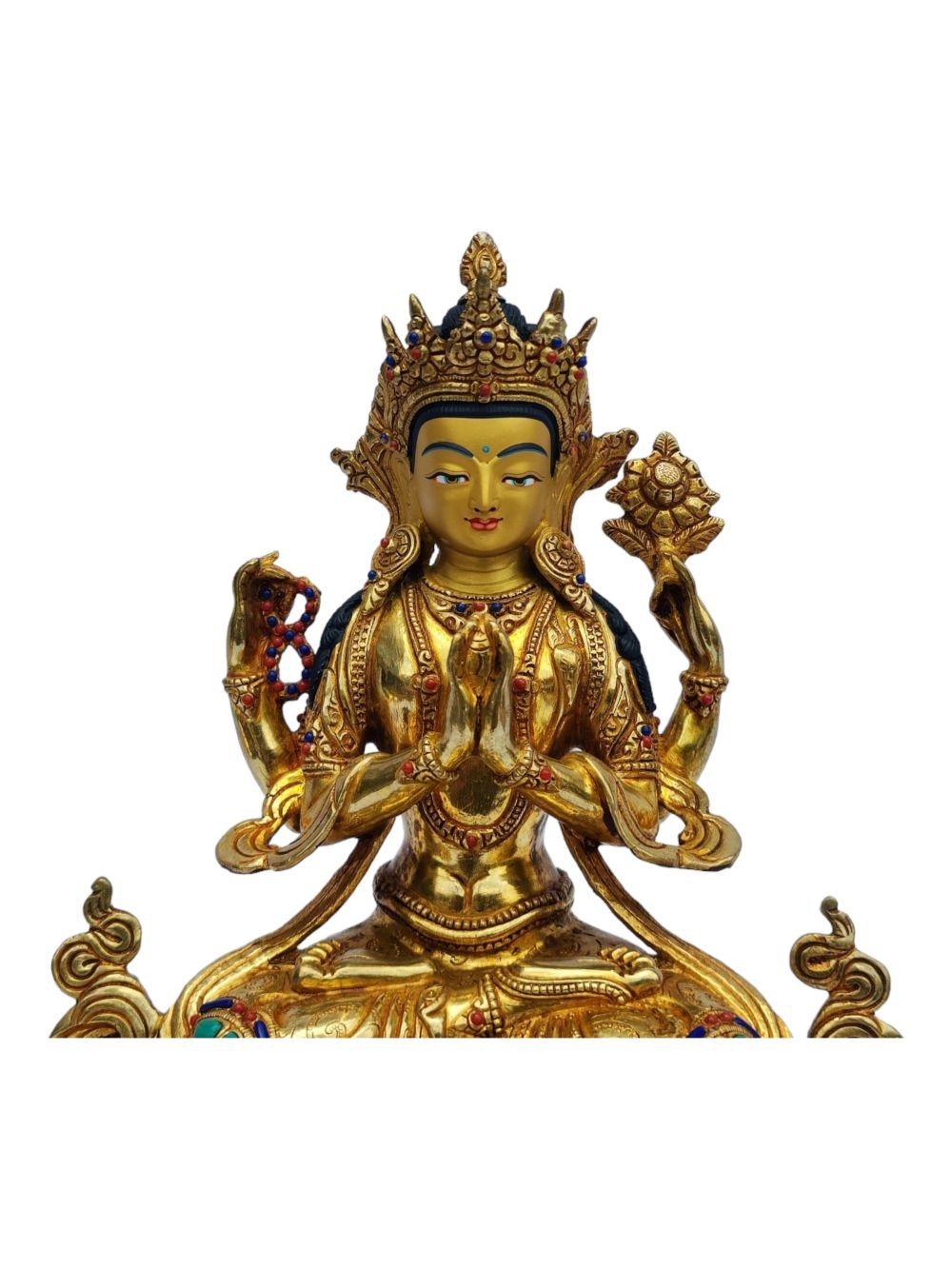 Chenrezig, Buddhist Handmade Statue, Full Gold Plated, Painted Face, Stone Setting , Bodhisattva of Compassion, Protector of All Beings