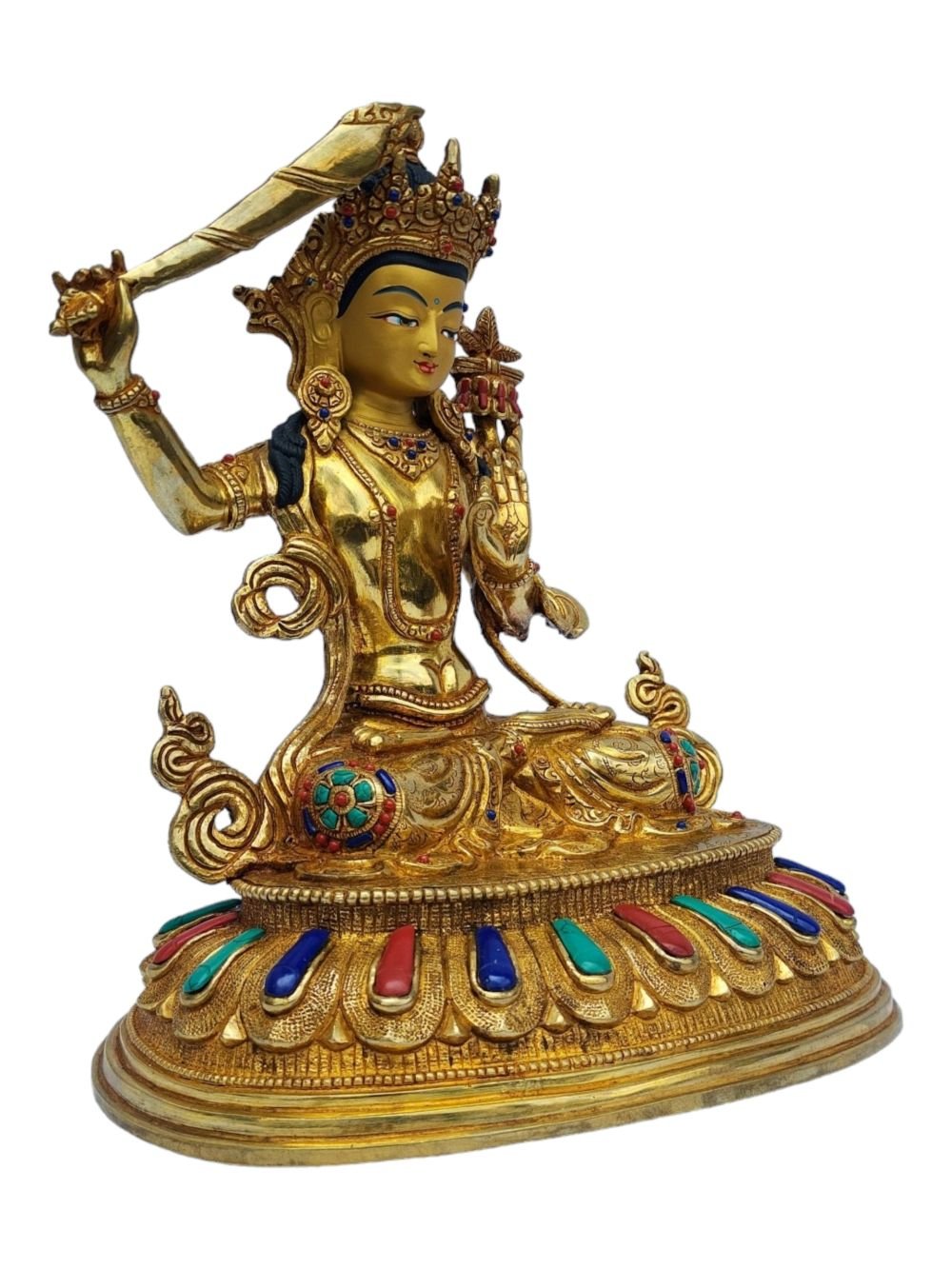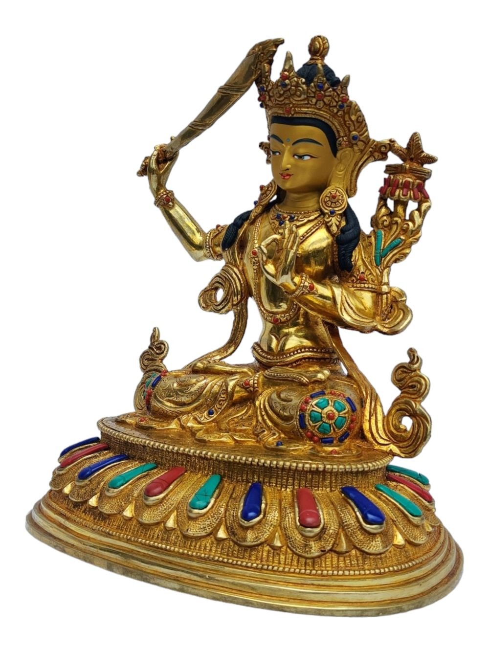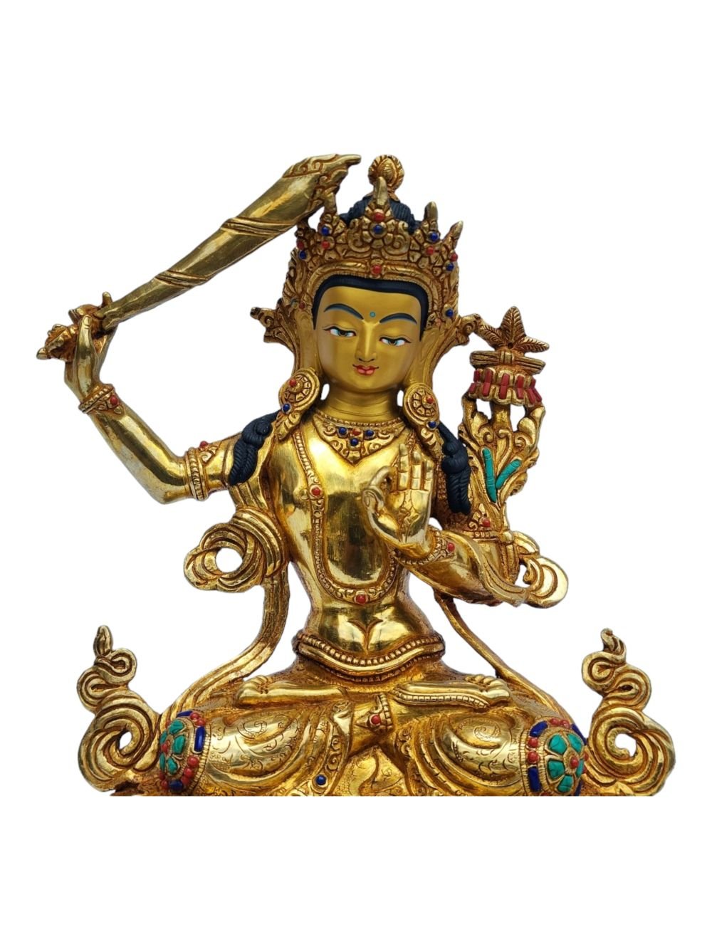 Manjushri, Buddhist Handmade Statue, Full Gold Plated, Painted Face, Stone Setting , Wisdom Buddha, cutting through ignorance with the sword of insight