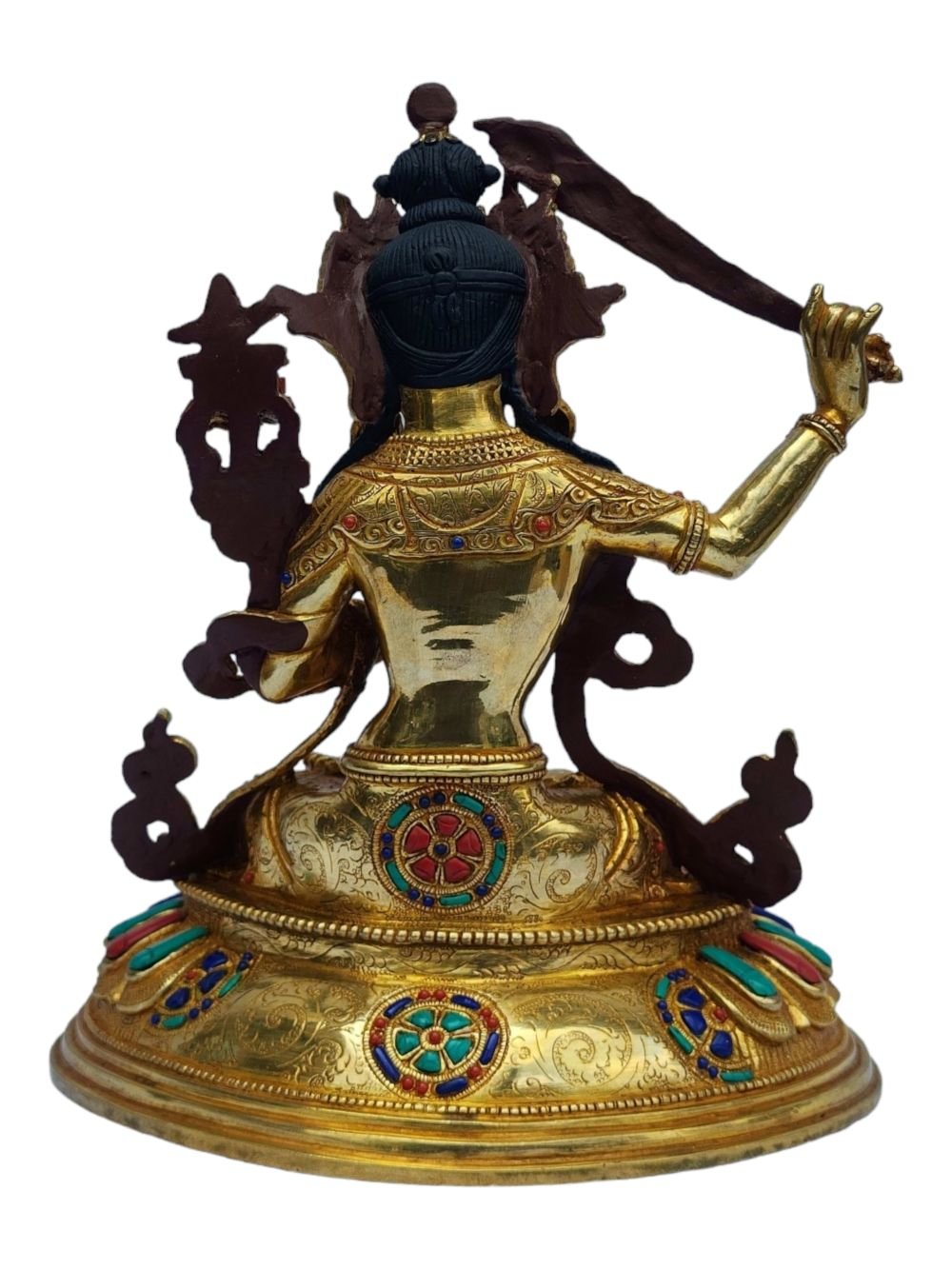 The Manjushri is adorned with an exquisite array of semi-precious stones, including turquoise, coral, and lapis lazuli. These stones are carefully selected and meticulously placed on the Manjushri's surface, adding a touch of opulence and enhancing its overall beauty. Each stone is thoughtfully positioned using a high-quality adhesive, ensuring secure and long-lasting attachment. The vibrant colors and unique patterns of the stones create a captivating contrast against the backdrop of the Manjushri, elevating its visual appeal and making it truly eye-catching. Read More