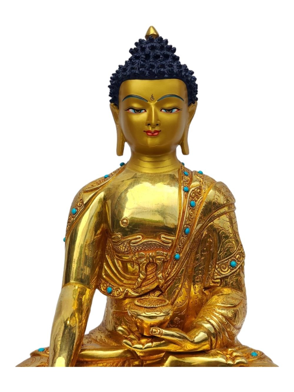 The face of Shakyamuni Buddha is painted with gold to enhance its significant features, particularly the eyes, and lips. This detailed painting is essential as it brings forth the crucial attributes of the expression of eyes and lips that metal carving alone cannot capture.