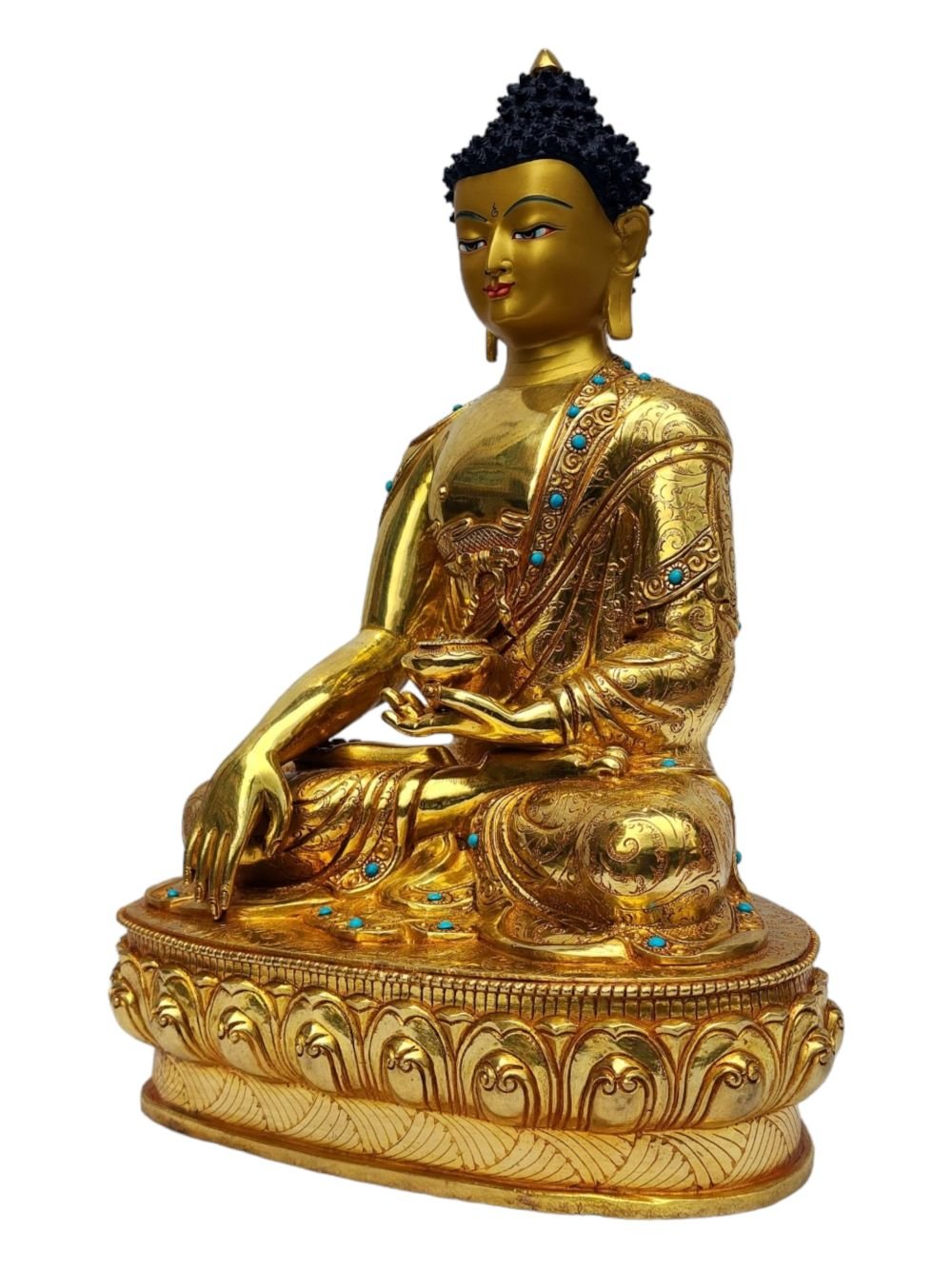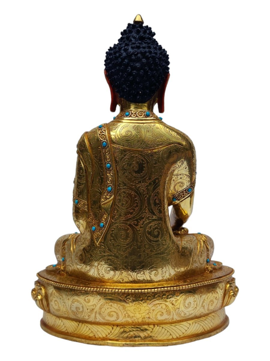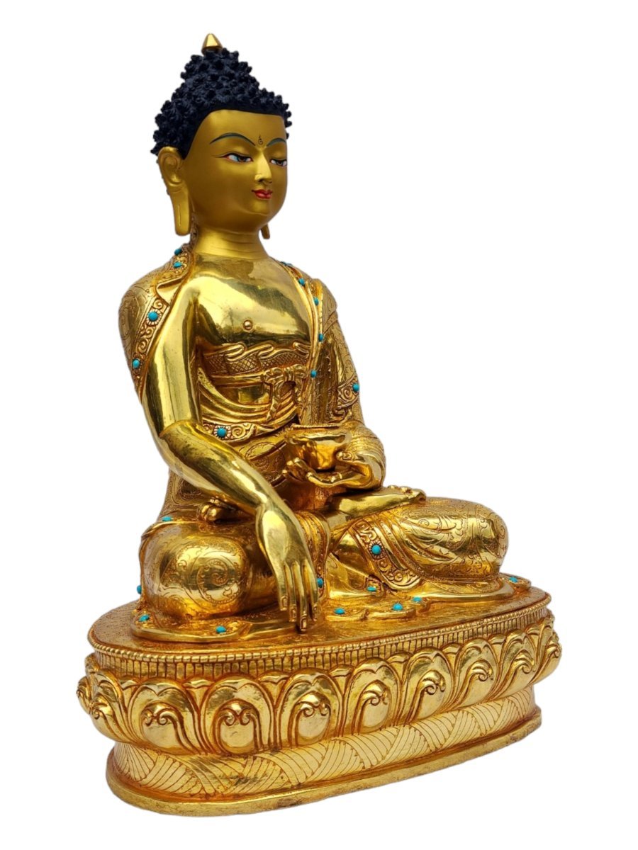 This Shakyamuni Buddha is finished with full gold plating. also known as mercury gold plating or fire gold plating. This traditional technique involves the application of a genuine layer of gold onto the Shakyamuni Buddha. Referred to as mercury gold plating, it is considered the correct and authentic form of gold plating in Nepal. Despite being more expensive than electroplating, this traditional mercury gold plating is gaining popularity again in Nepal. People are drawn to its authenticity, longevity, and the unmatched beauty it brings to the Shakyamuni Buddha. The resurgence of interest in this traditional form of gold plating reflects a growing appreciation for the craftsmanship and cultural heritage of Nepal Read More