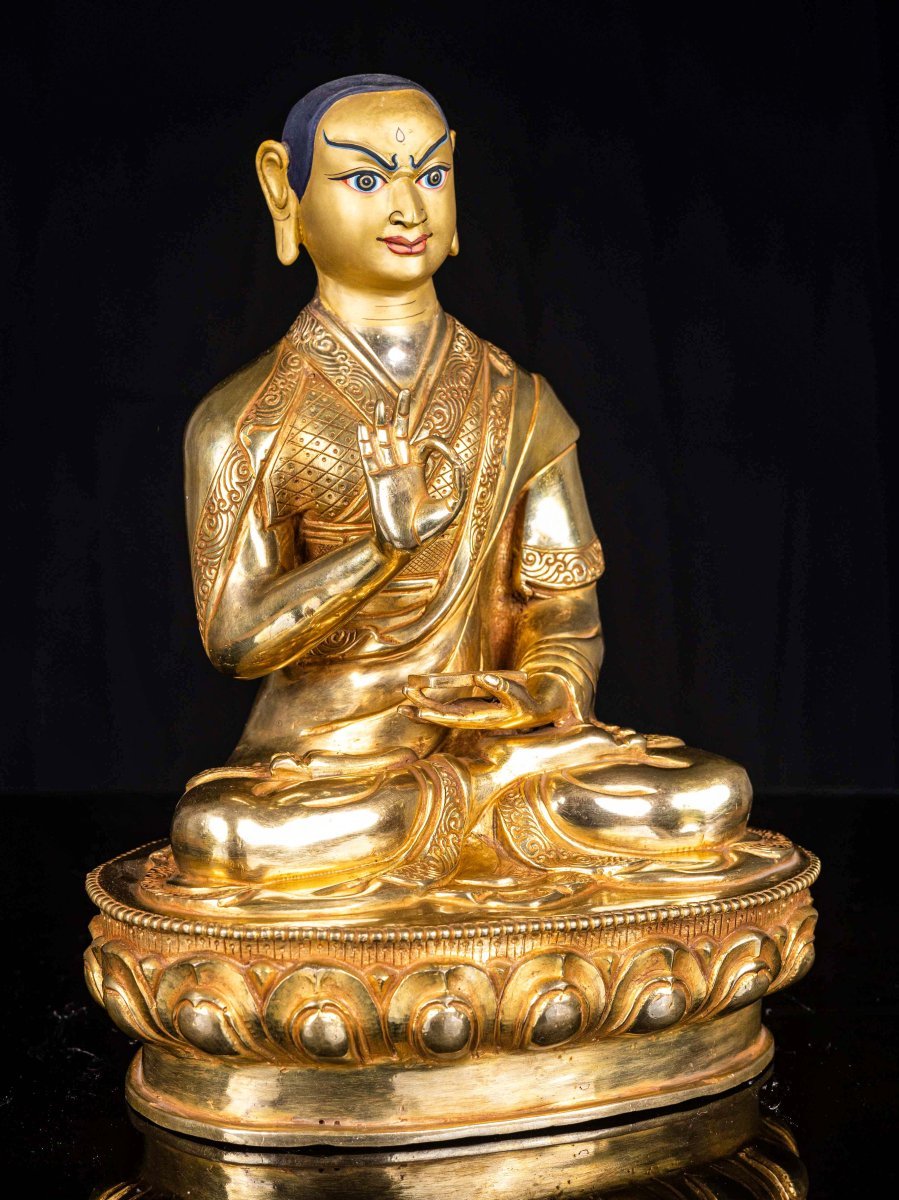 This Tsongkhapa is finished with full gold plating. also known as mercury gold plating or fire gold plating. This traditional technique involves the application of a genuine layer of gold onto the Tsongkhapa. Referred to as mercury gold plating, it is considered the correct and authentic form of gold plating in Nepal. Despite being more expensive than electroplating, this traditional mercury gold plating is gaining popularity again in Nepal. People are drawn to its authenticity, longevity, and the unmatched beauty it brings to the Tsongkhapa. The resurgence of interest in this traditional form of gold plating reflects a growing appreciation for the craftsmanship and cultural heritage of Nepal Read More