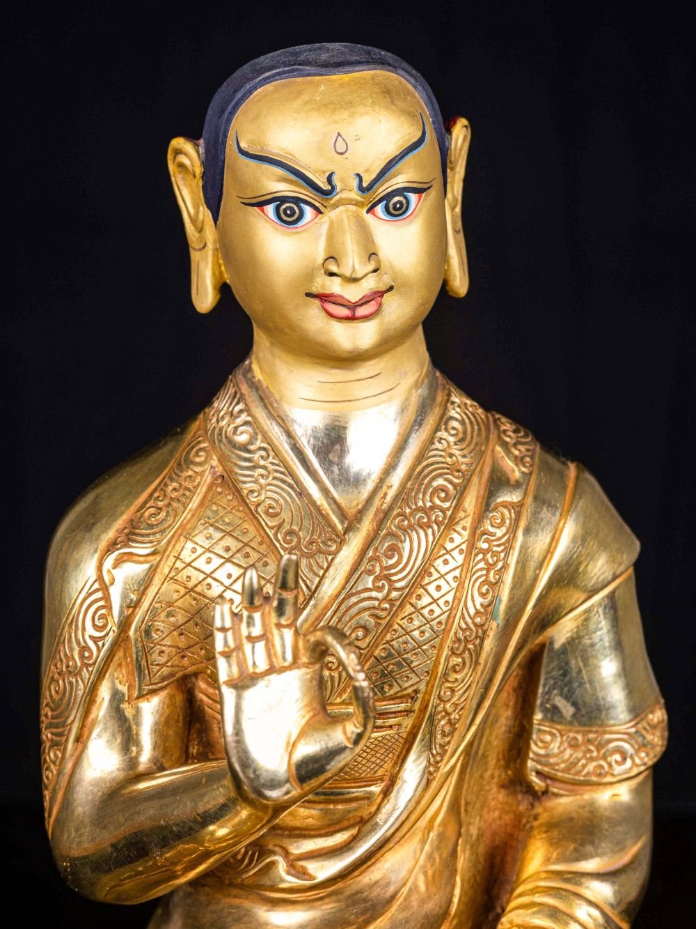 The face of Tsongkhapa is painted with gold to enhance its significant features, particularly the eyes, and lips. This detailed painting is essential as it brings forth the crucial attributes of the expression of eyes and lips that metal carving alone cannot capture.