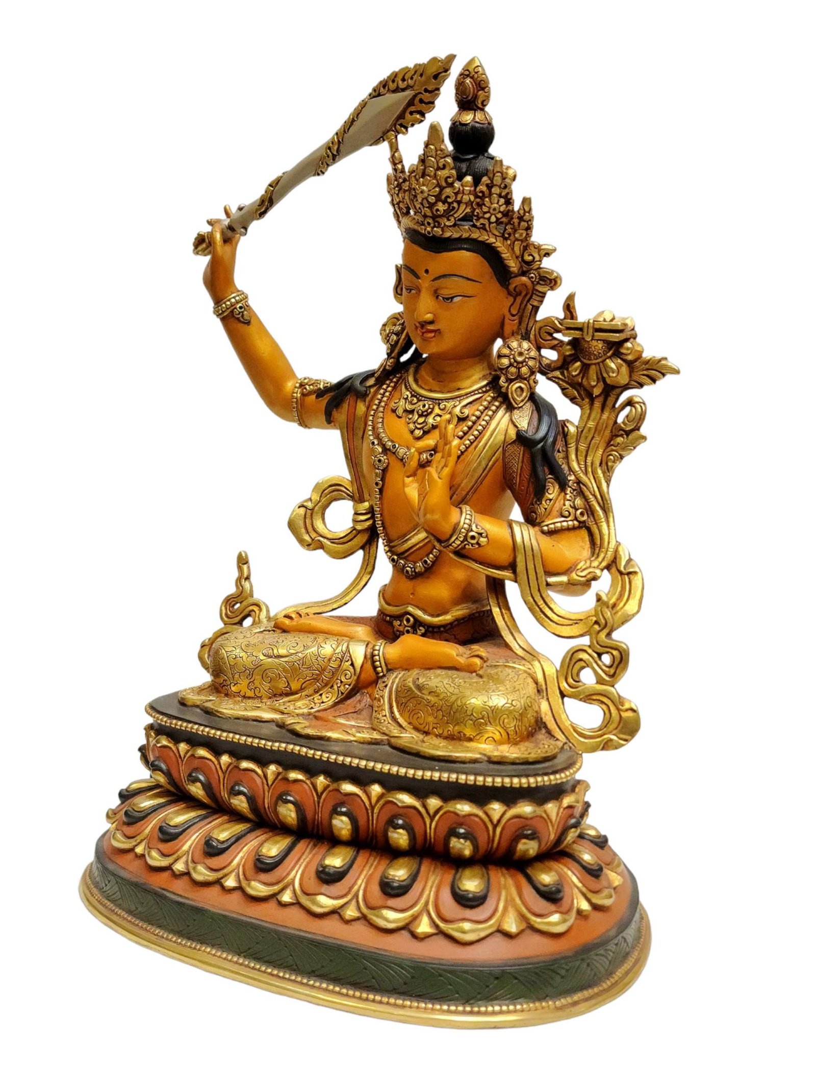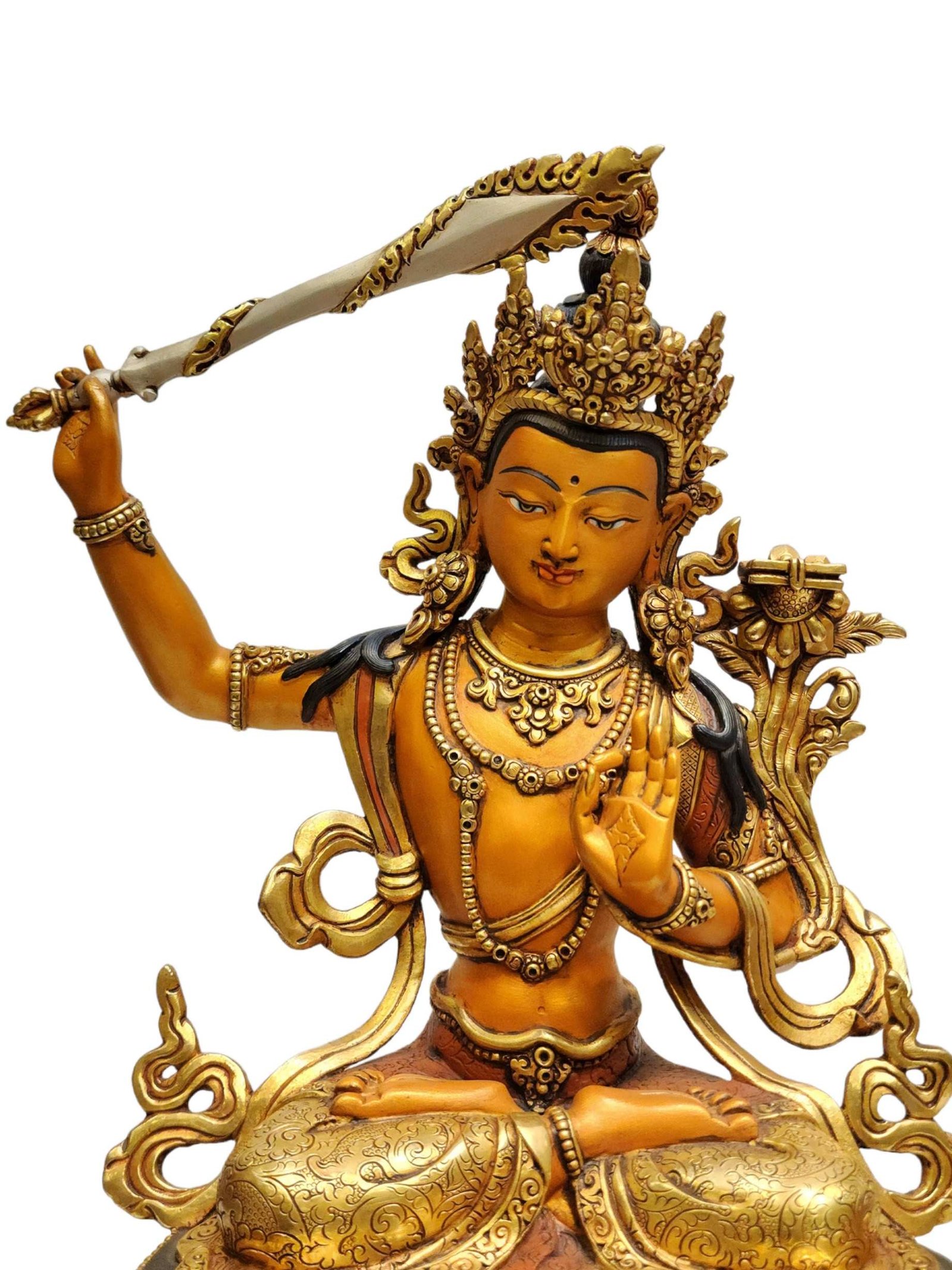 Manjushri, Buddhist Handmade Statue, Full Gold Plated, Painted Face, Thangka Color Finishing , Wisdom Buddha, cutting through ignorance with the sword of insight