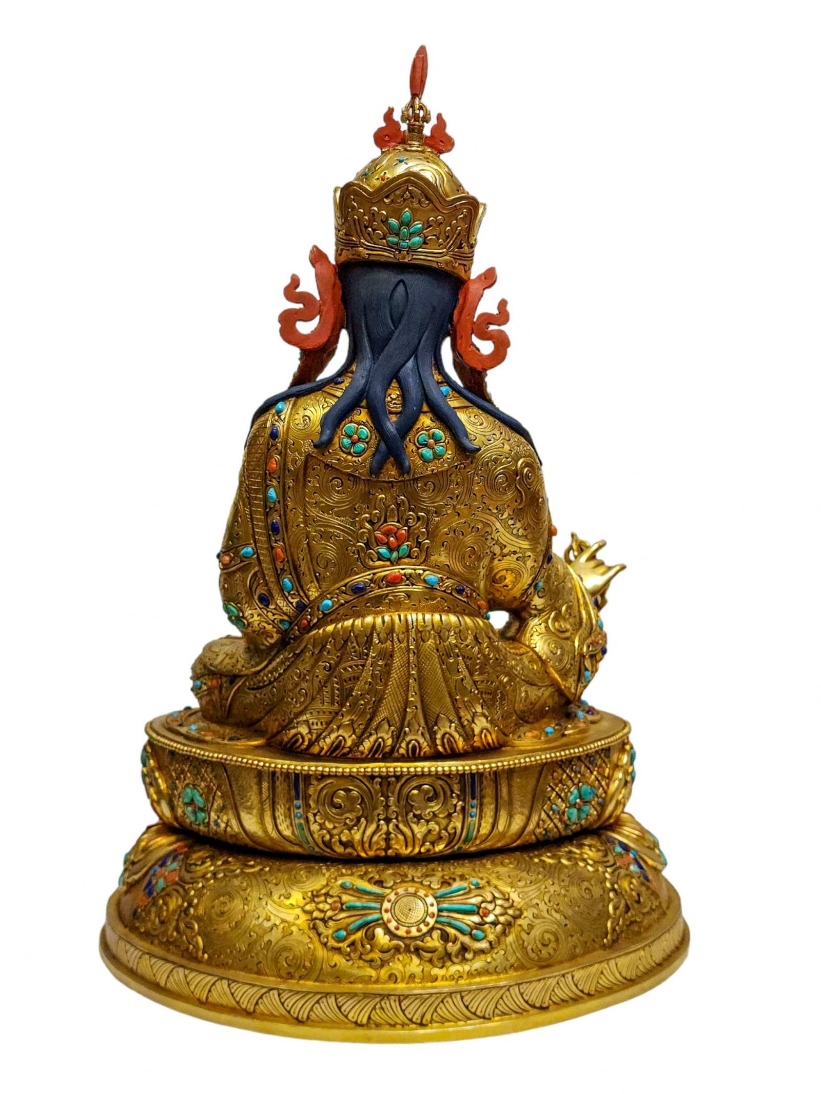 The face of Padmasambhava is painted with gold to enhance its significant features, particularly the eyes, and lips. This detailed painting is essential as it brings forth the crucial attributes of the expression of eyes and lips that metal carving alone cannot capture.