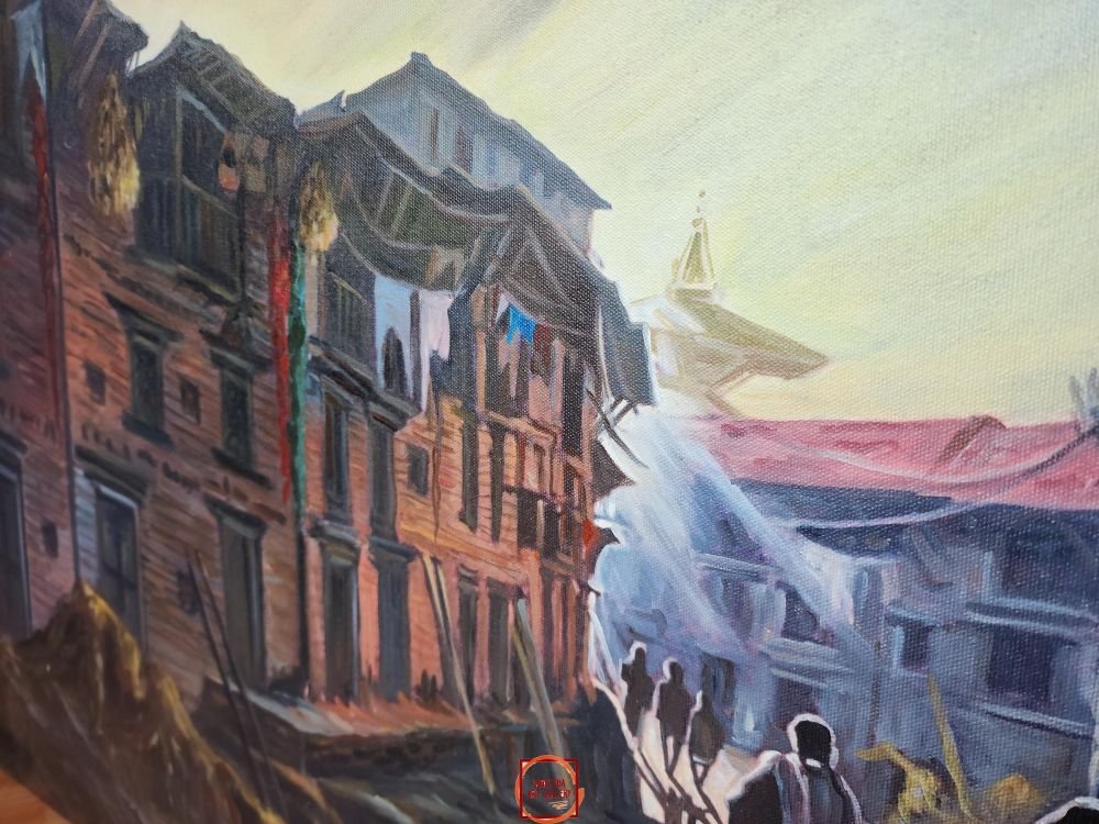 A Nepali oil painting is a work of art created using oil paints on canvas or another surface. Nepali oil paintings often depict scenes and subjects that are significant to Nepali culture and heritage, such as mountains, landscapes, Newari life, Kathmandu, temples, and stupas.