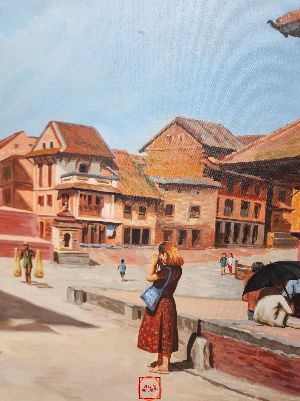 A Nepali oil painting is a work of art created using oil paints on canvas or another surface. Nepali oil paintings often depict scenes and subjects that are significant to Nepali culture and heritage, such as mountains, landscapes, Newari life, Kathmandu, temples, and stupas.
