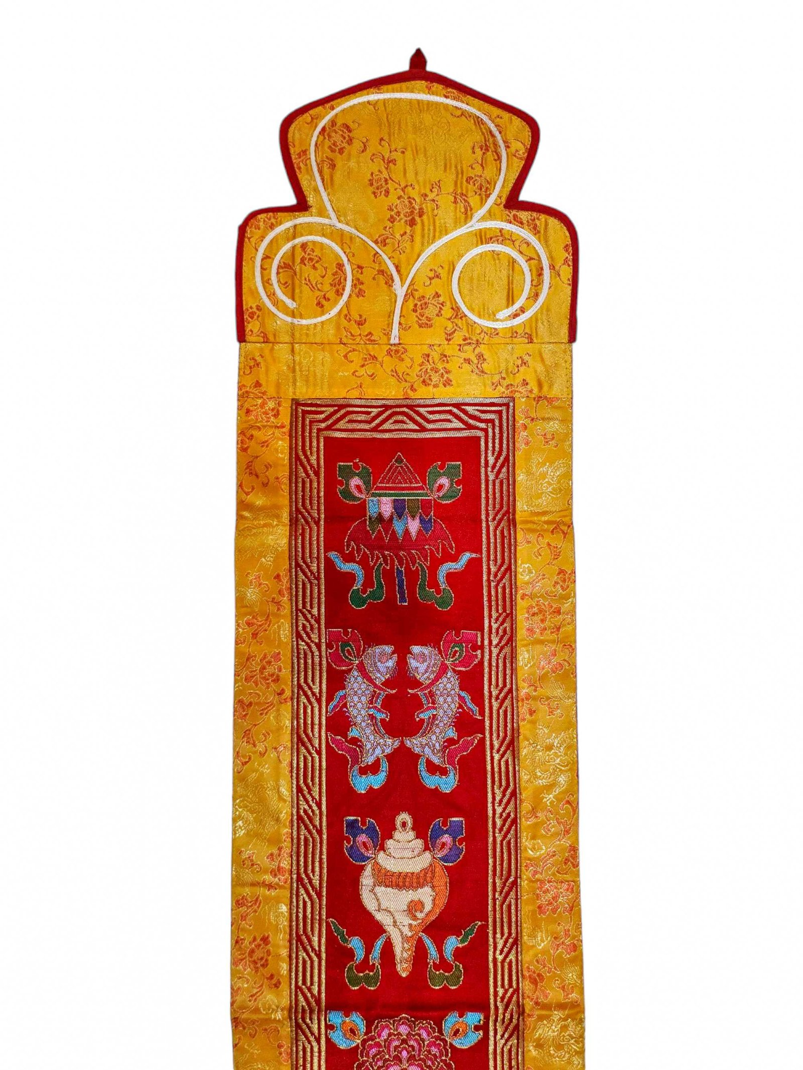 Tibetan Cochin Brocade Wall Hanging with Embroidered Ashtamangala , representing prosperity and divine protection
