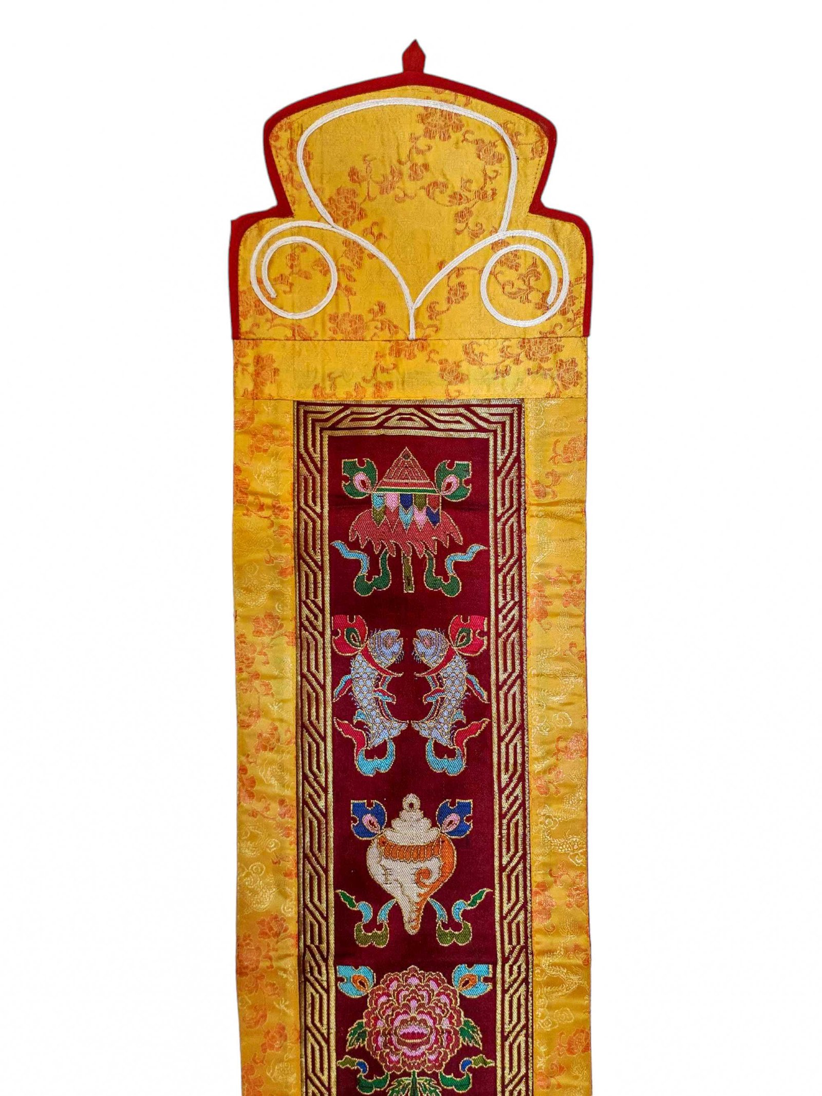 Tibetan Cochin Brocade Wall Hanging with Embroidered Ashtamangala , representing prosperity and divine protection