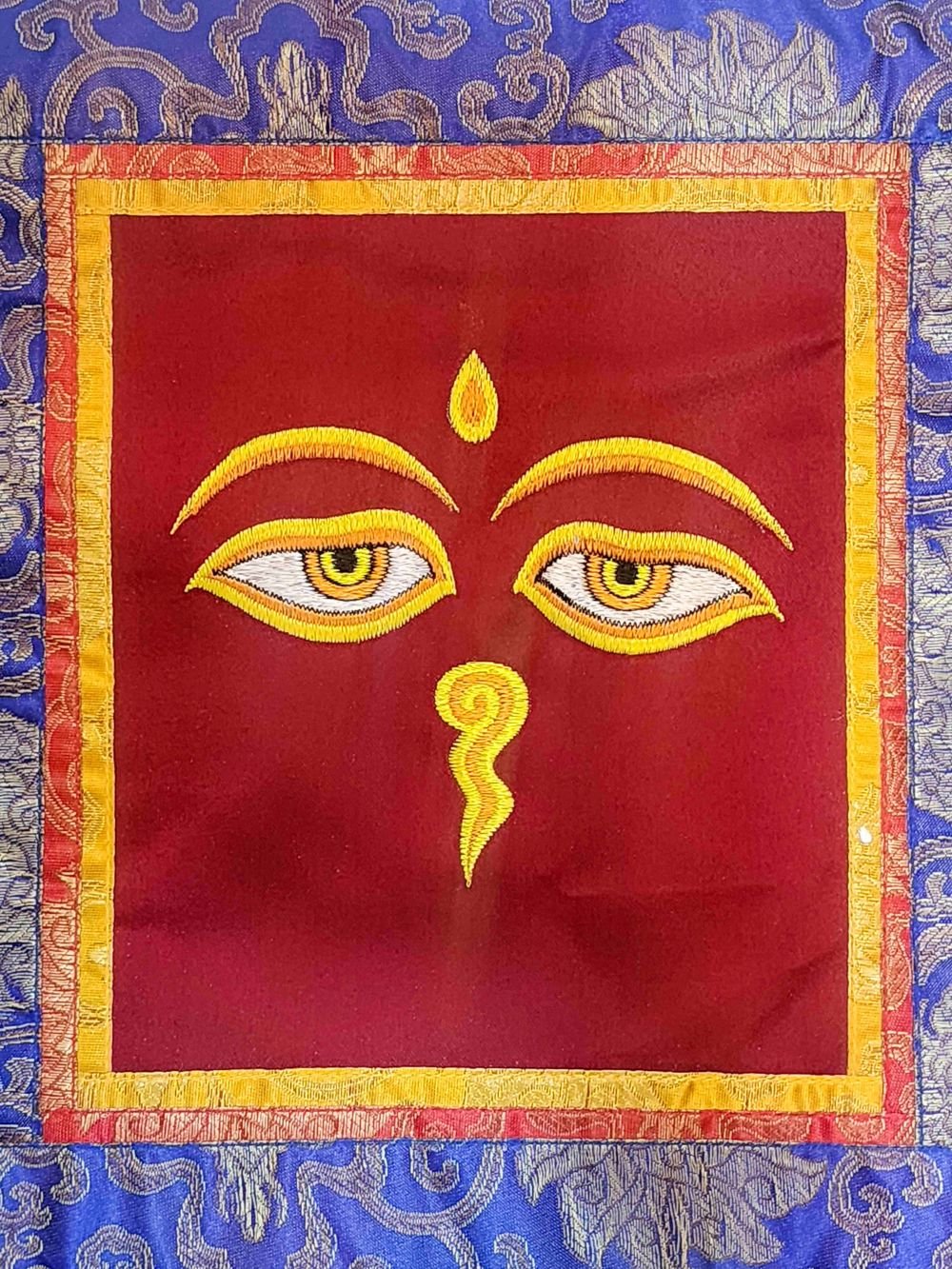 Tibetan Cochin Brocade Wall Hanging with Embroidered Buddha Eye , symbolizing awareness and spiritual insight