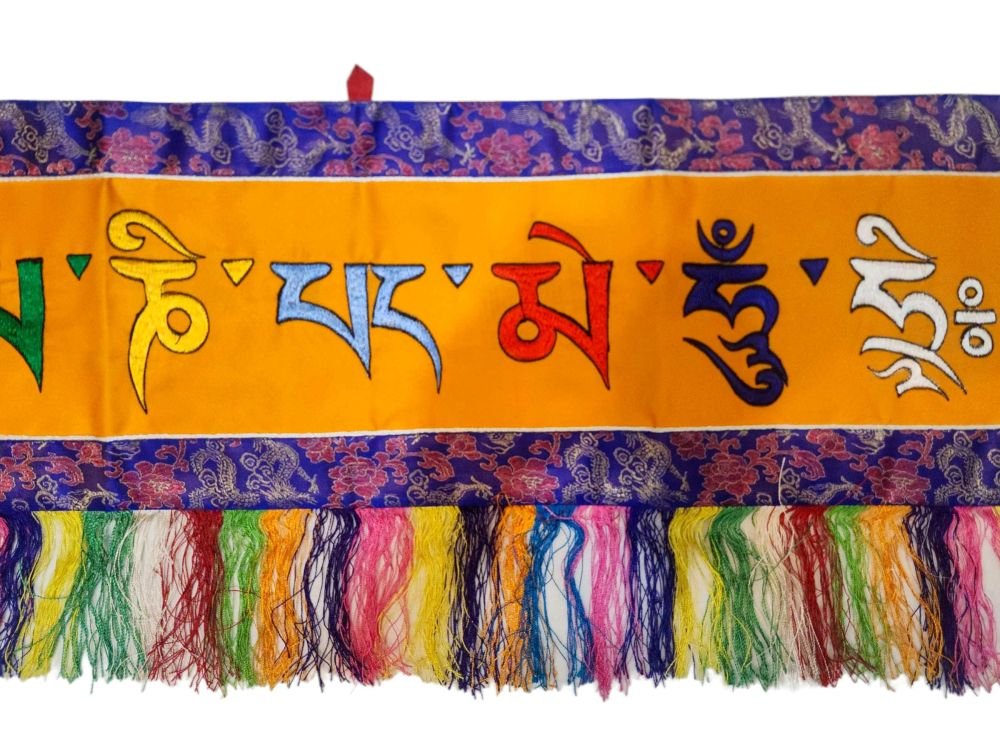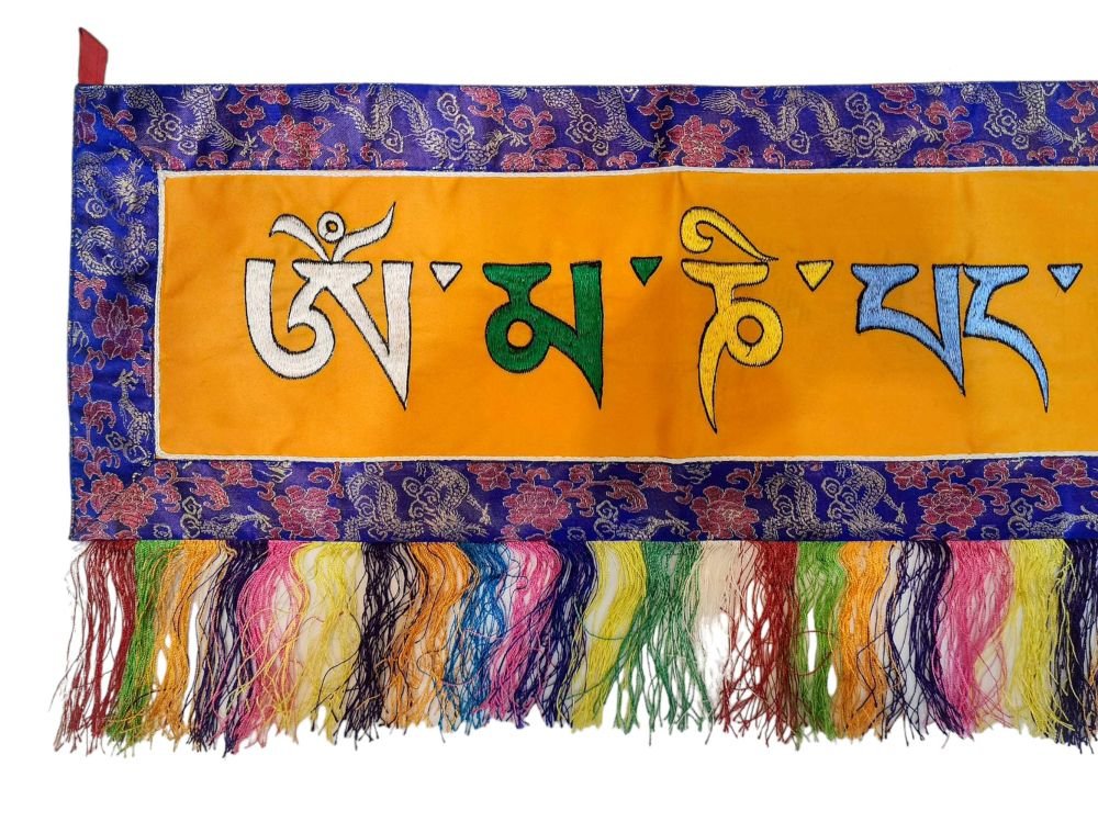 Tibetan Cochin Brocade Wall Hanging with Embroidered OM Mani Padme Hum , The mantra of compassion, invoking the blessings of Avalokiteshvara