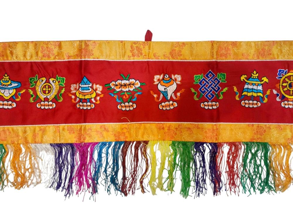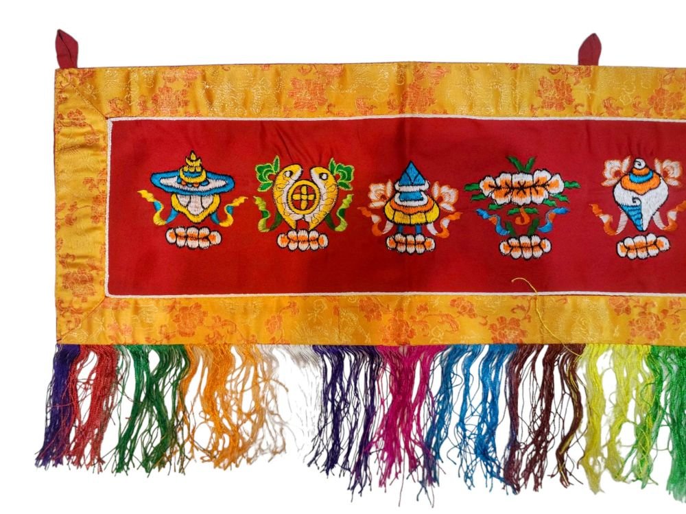 Tibetan Cochin Brocade Wall Hanging with Embroidered Ashtamangala , representing prosperity and divine protection