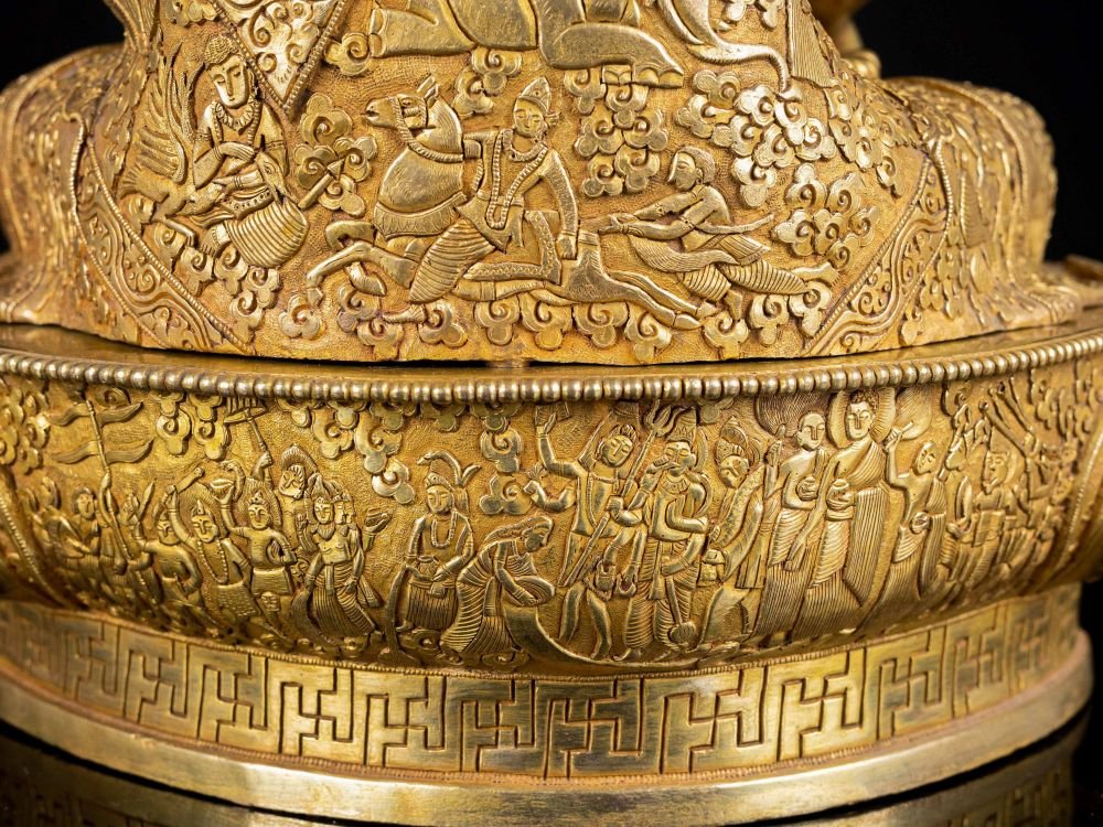 The face of Shakyamuni Buddha is painted with gold to enhance its significant features, particularly the eyes, and lips. This detailed painting is essential as it brings forth the crucial attributes of the expression of eyes and lips that metal carving alone cannot capture.