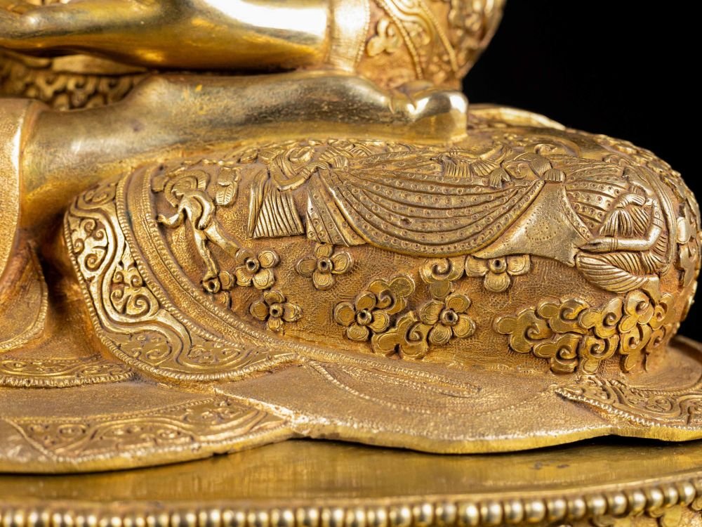 This Shakyamuni Buddha is finished with full gold plating. also known as mercury gold plating or fire gold plating. This traditional technique involves the application of a genuine layer of gold onto the Shakyamuni Buddha. Referred to as mercury gold plating, it is considered the correct and authentic form of gold plating in Nepal. Despite being more expensive than electroplating, this traditional mercury gold plating is gaining popularity again in Nepal. People are drawn to its authenticity, longevity, and the unmatched beauty it brings to the Shakyamuni Buddha. The resurgence of interest in this traditional form of gold plating reflects a growing appreciation for the craftsmanship and cultural heritage of Nepal Read More