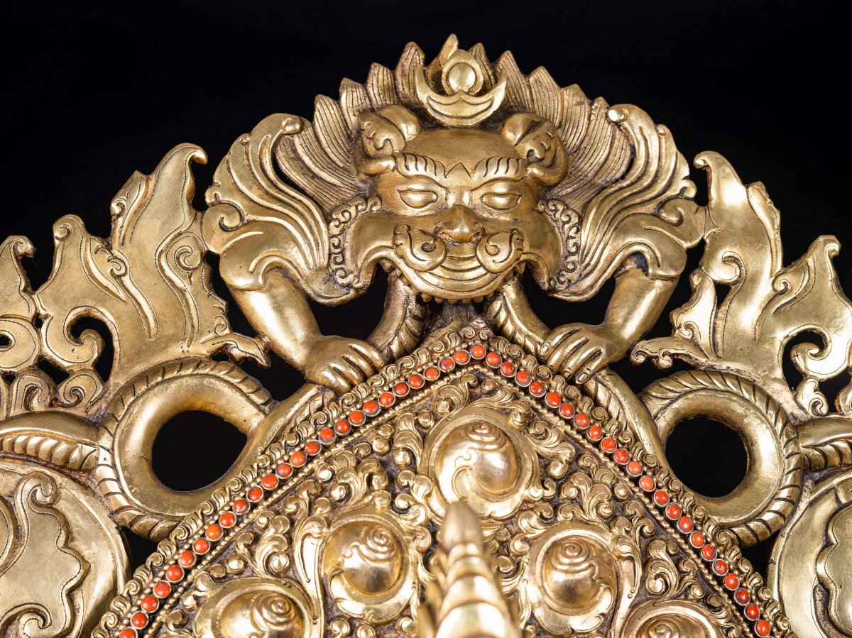 The face of Green Tara is painted with gold to enhance its significant features, particularly the eyes, and lips. This detailed painting is essential as it brings forth the crucial attributes of the expression of eyes and lips that metal carving alone cannot capture.