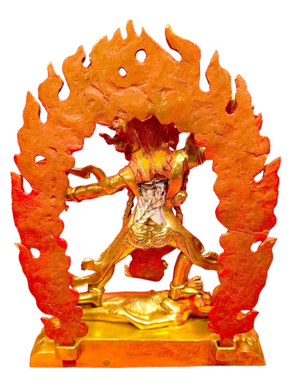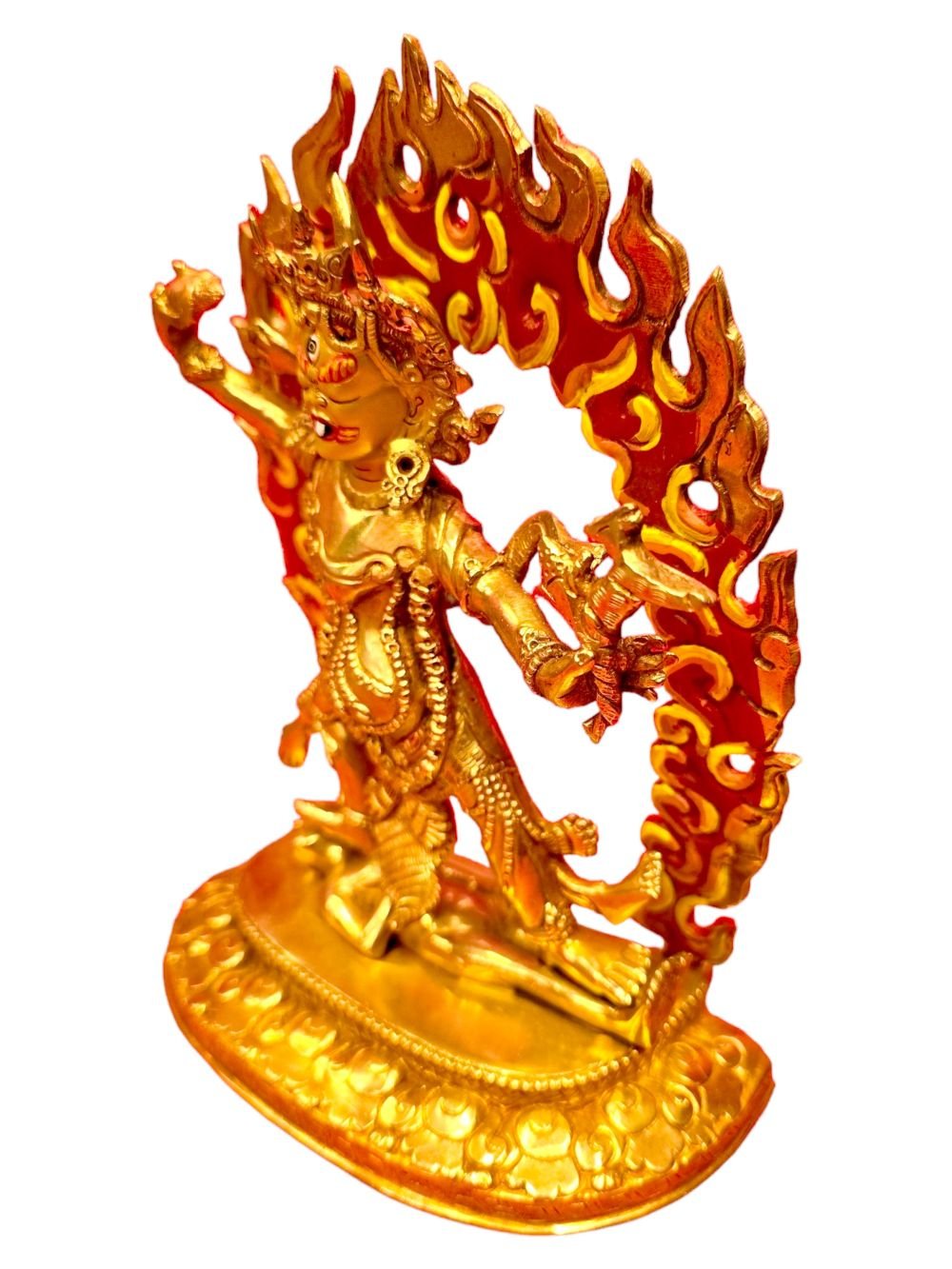 Her demeanour expresses determination. With her right foot she steps upon corpses, symbols of the ego. Her vajra laugh bares a split tongue or a forked tongue and a single tooth. She is dressed in a skull necklace and with a tiger and a human skin. She is surrounded by flames representing wisdom.