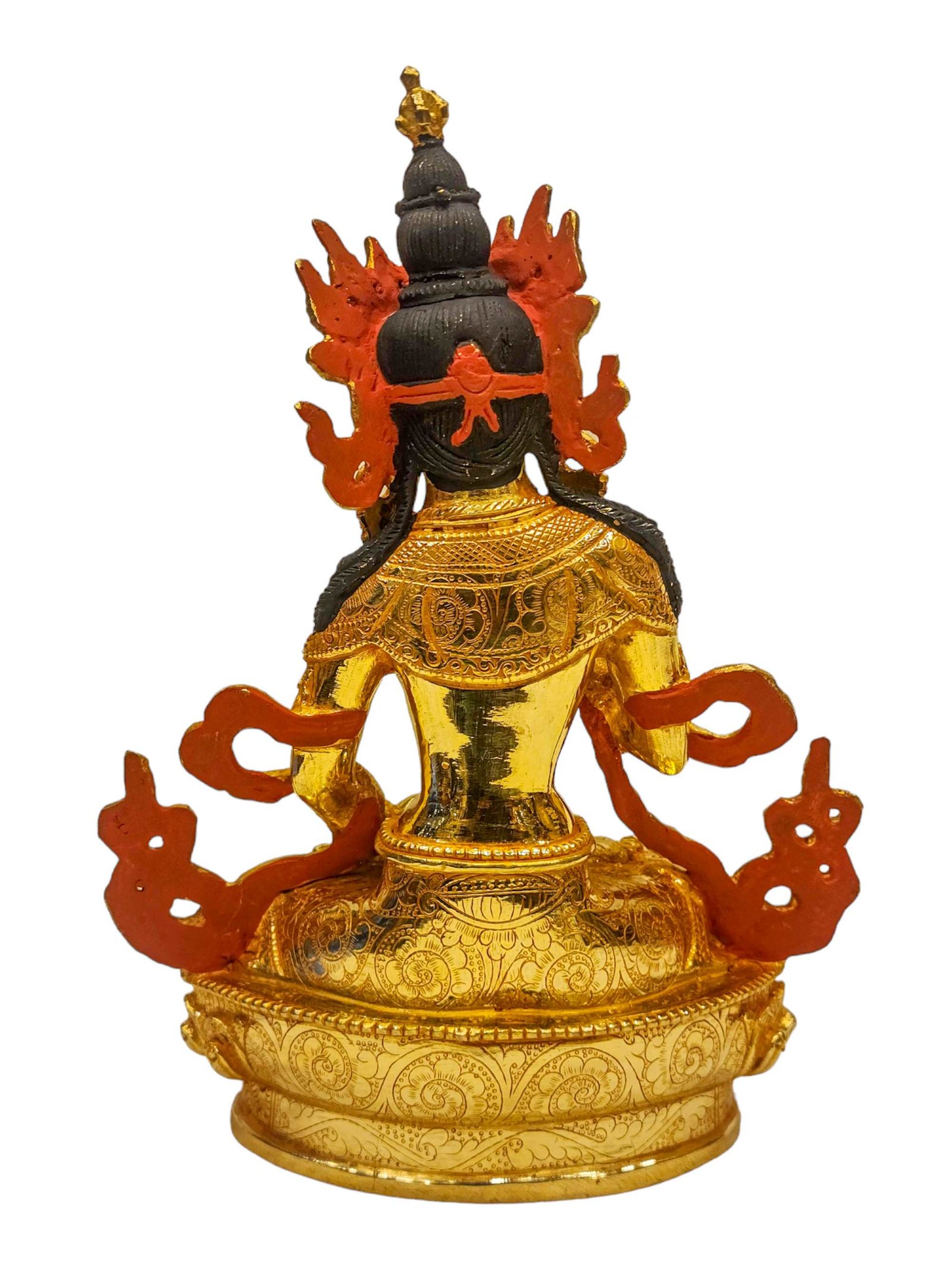 This Vajrasattva is finished with full gold plating. also known as mercury gold plating or fire gold plating. This traditional technique involves the application of a genuine layer of gold onto the Vajrasattva. Referred to as mercury gold plating, it is considered the correct and authentic form of gold plating in Nepal. Despite being more expensive than electroplating, this traditional mercury gold plating is gaining popularity again in Nepal. People are drawn to its authenticity, longevity, and the unmatched beauty it brings to the Vajrasattva. The resurgence of interest in this traditional form of gold plating reflects a growing appreciation for the craftsmanship and cultural heritage of Nepal Read More