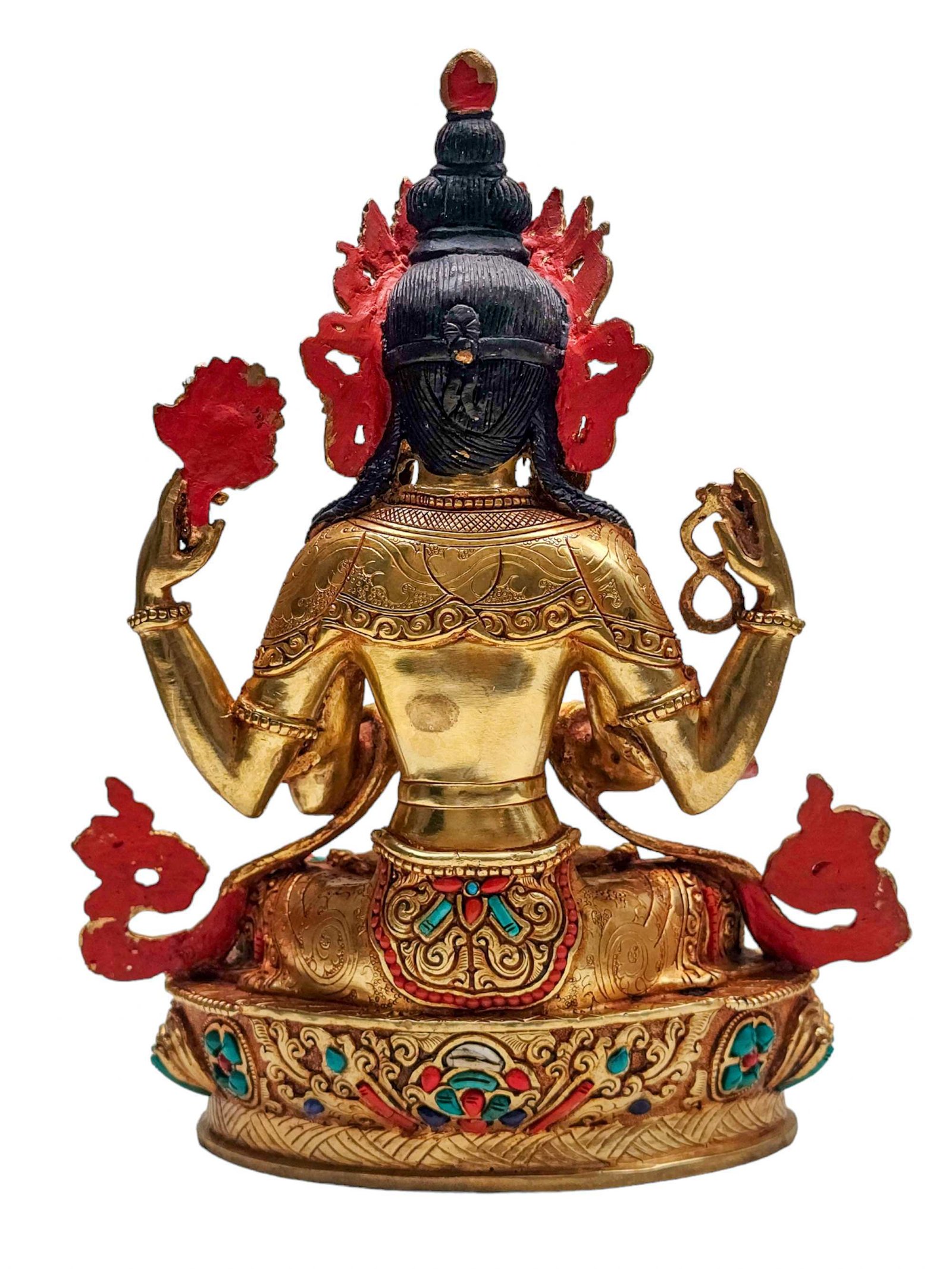 The Chenrezig is adorned with an exquisite array of semi-precious stones, including turquoise, coral, and lapis lazuli. These stones are carefully selected and meticulously placed on the Chenrezig's surface, adding a touch of opulence and enhancing its overall beauty. Each stone is thoughtfully positioned using a high-quality adhesive, ensuring secure and long-lasting attachment. The vibrant colors and unique patterns of the stones create a captivating contrast against the backdrop of the Chenrezig, elevating its visual appeal and making it truly eye-catching. Read More