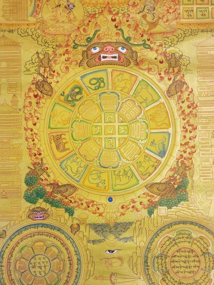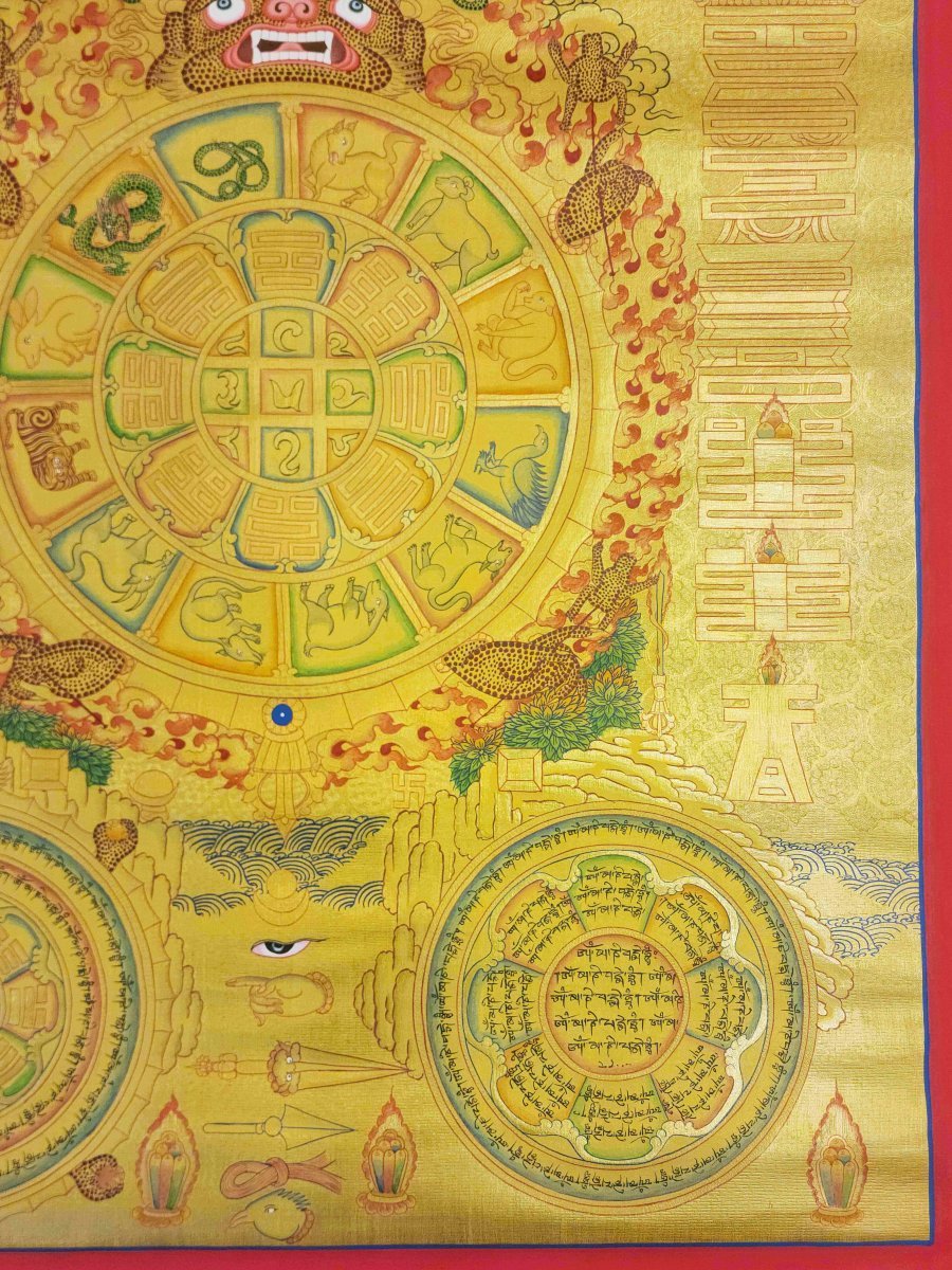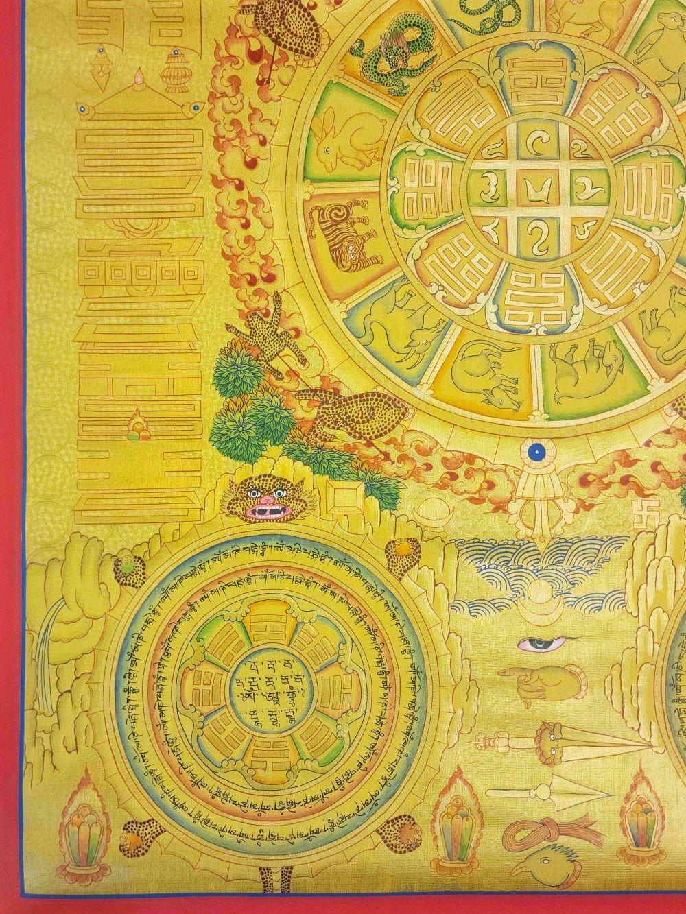 This thangka of Tibetan Calendar has real gold painted on its surface along with other paints. This is an ancient process of decorating the thangka in Tibetan Buddhism, Here gold is ground into gold dust, which is then mixed with other undisclosed material to make it paintable on the canvas. this mixture is then mixed with transparent glue and painted on the thangka. Read More