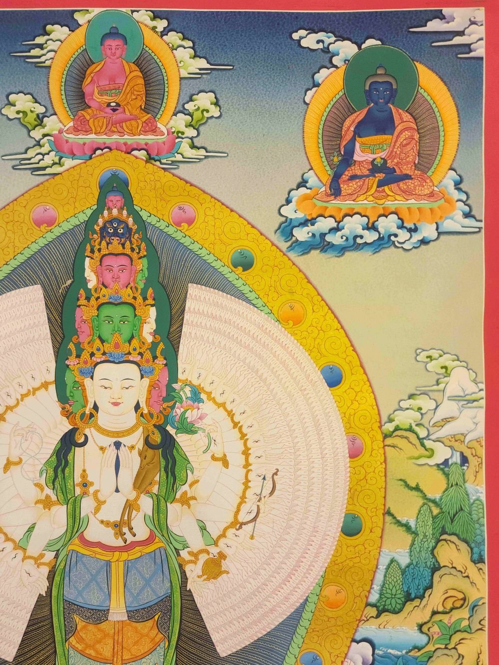 Sahasrabhuja Avalokiteshvara the Thousand-Armed, Thousand-Eyed form of Avalokiteshvara, the Bodhisattva of Infinite Compassion. Each of the 1,000 hands represents his boundless ability to help all sentient beings, while the eye in each palm symbolizes wisdom and omnipresent awareness.