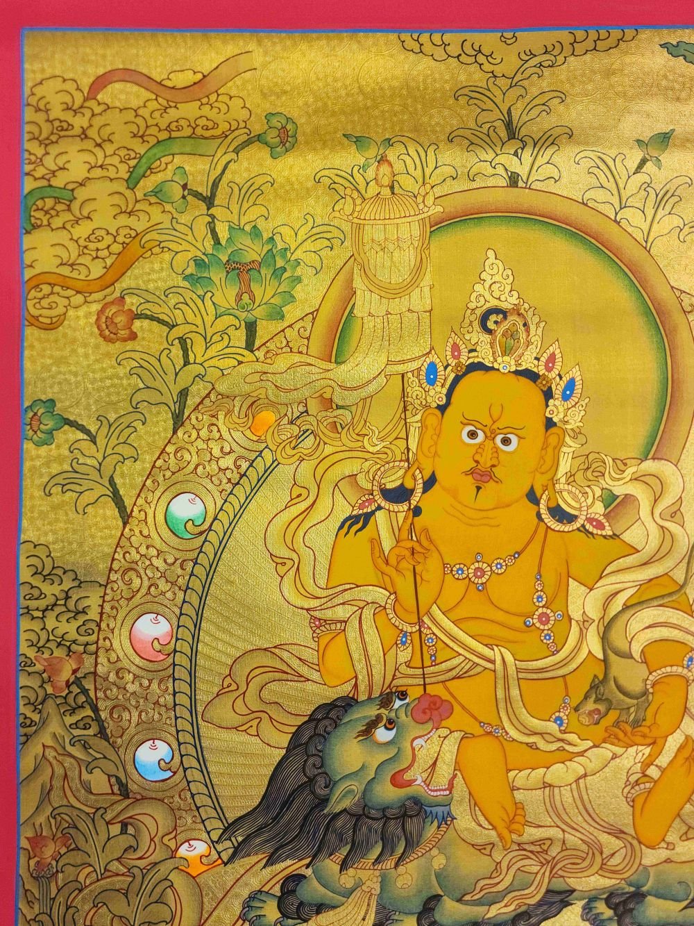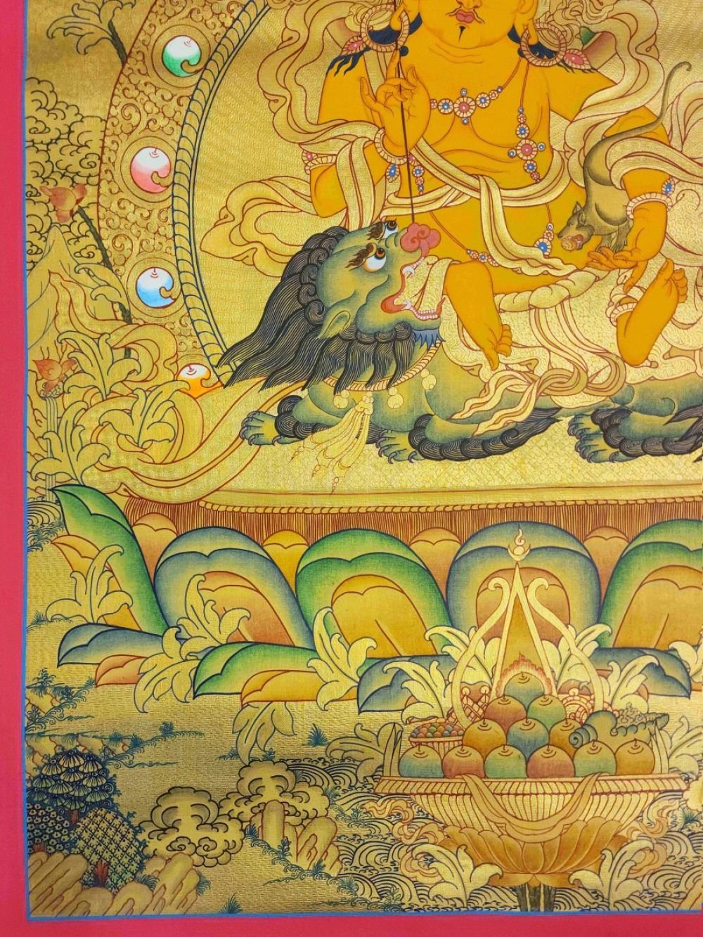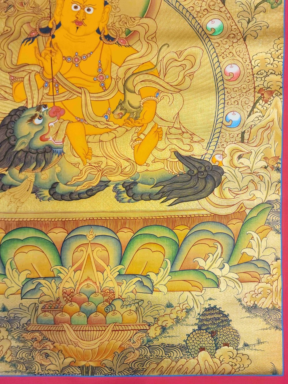 This thangka of Yellow Jambhala has real gold painted on its surface along with other paints. This is an ancient process of decorating the thangka in Tibetan Buddhism, Here gold is ground into gold dust, which is then mixed with other undisclosed material to make it paintable on the canvas. this mixture is then mixed with transparent glue and painted on the thangka. Read More