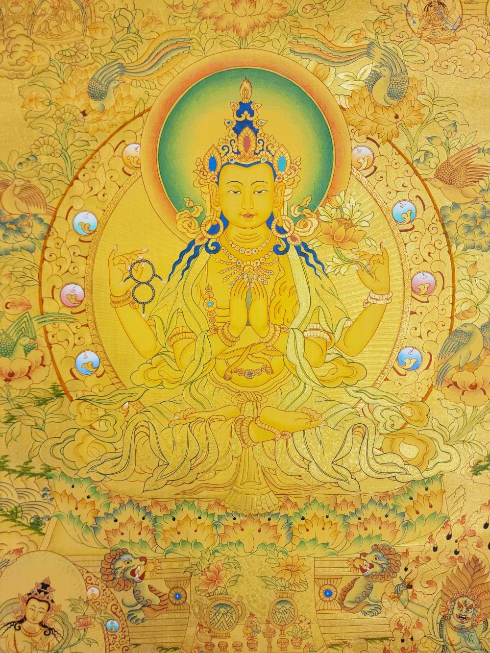 Chenrezig, Buddhist Traditional Painting, Hand Painted, Real Gold , Bodhisattva of Compassion, Protector of All Beings