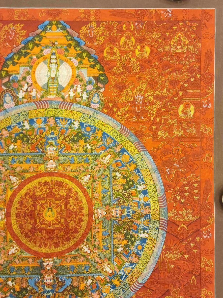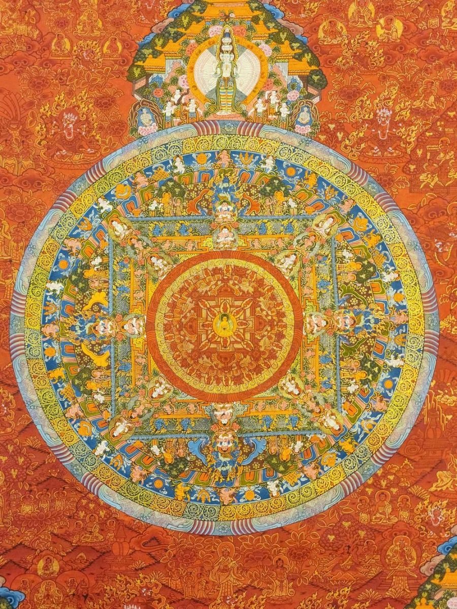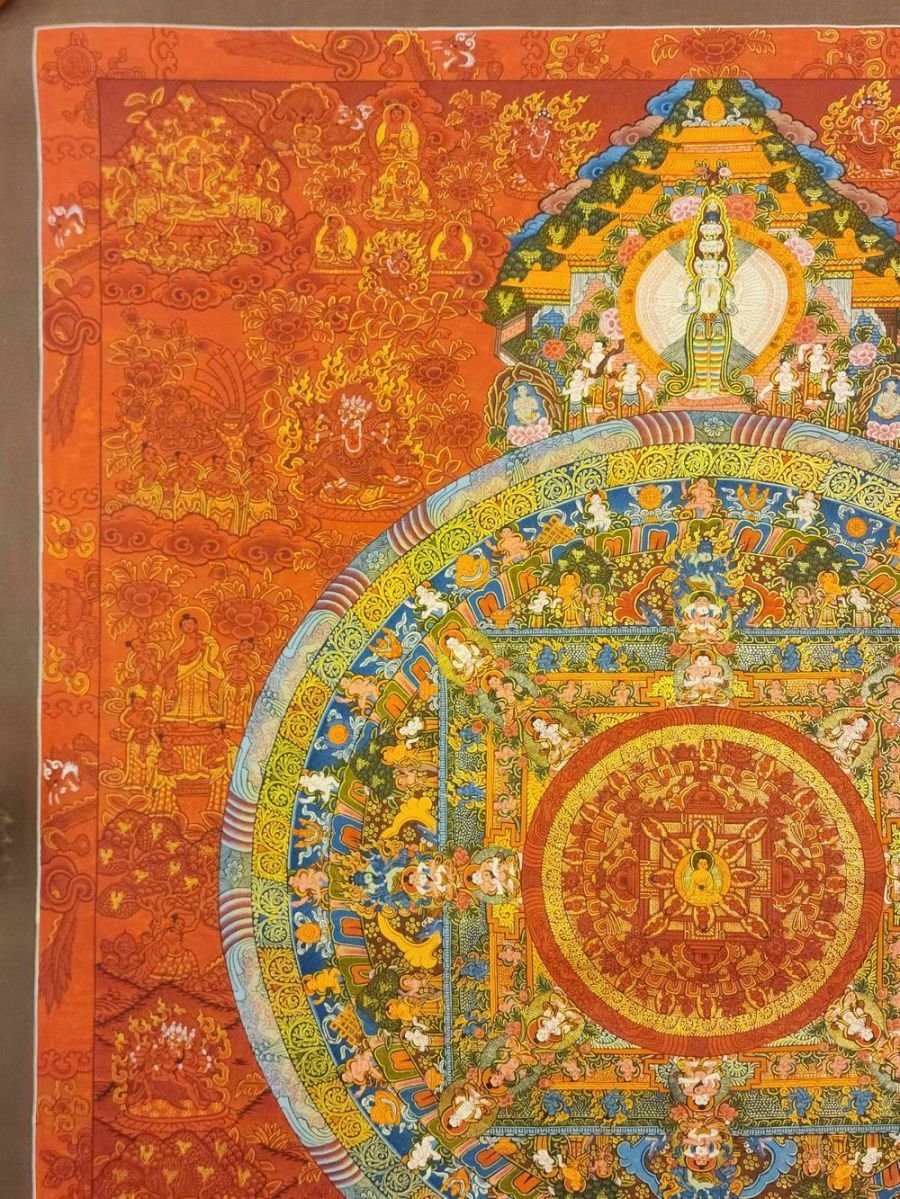 Mandala Thangka painting is a revered form of sacred art in Buddhism, characterized by intricate and vibrant depictions on cotton or silk. These paintings often feature a central deity or Buddha figure surrounded by meticulously crafted symmetrical patterns, geometric designs, and symbolic elements. Mandala Thangkas serve as visual aids for meditation and spiritual growth, guiding practitioners towards inner peace, harmony, and enlightenment. Through their precise brushwork and rich symbolism, these artworks invite viewers to contemplate the profound spiritual journey within themselves, fostering mindfulness, concentration, and a deeper connection with the universal truths of Buddhism. Read More