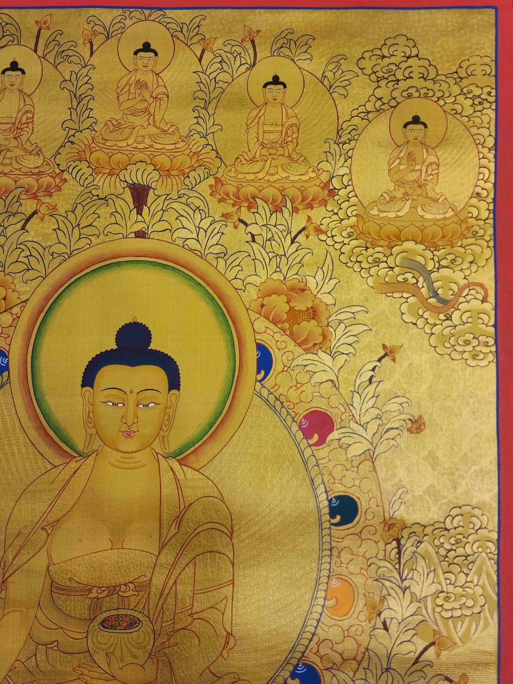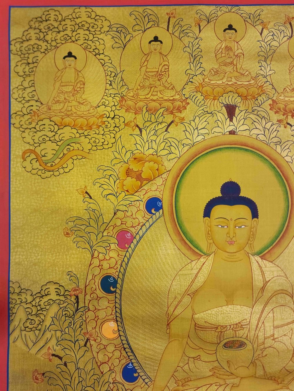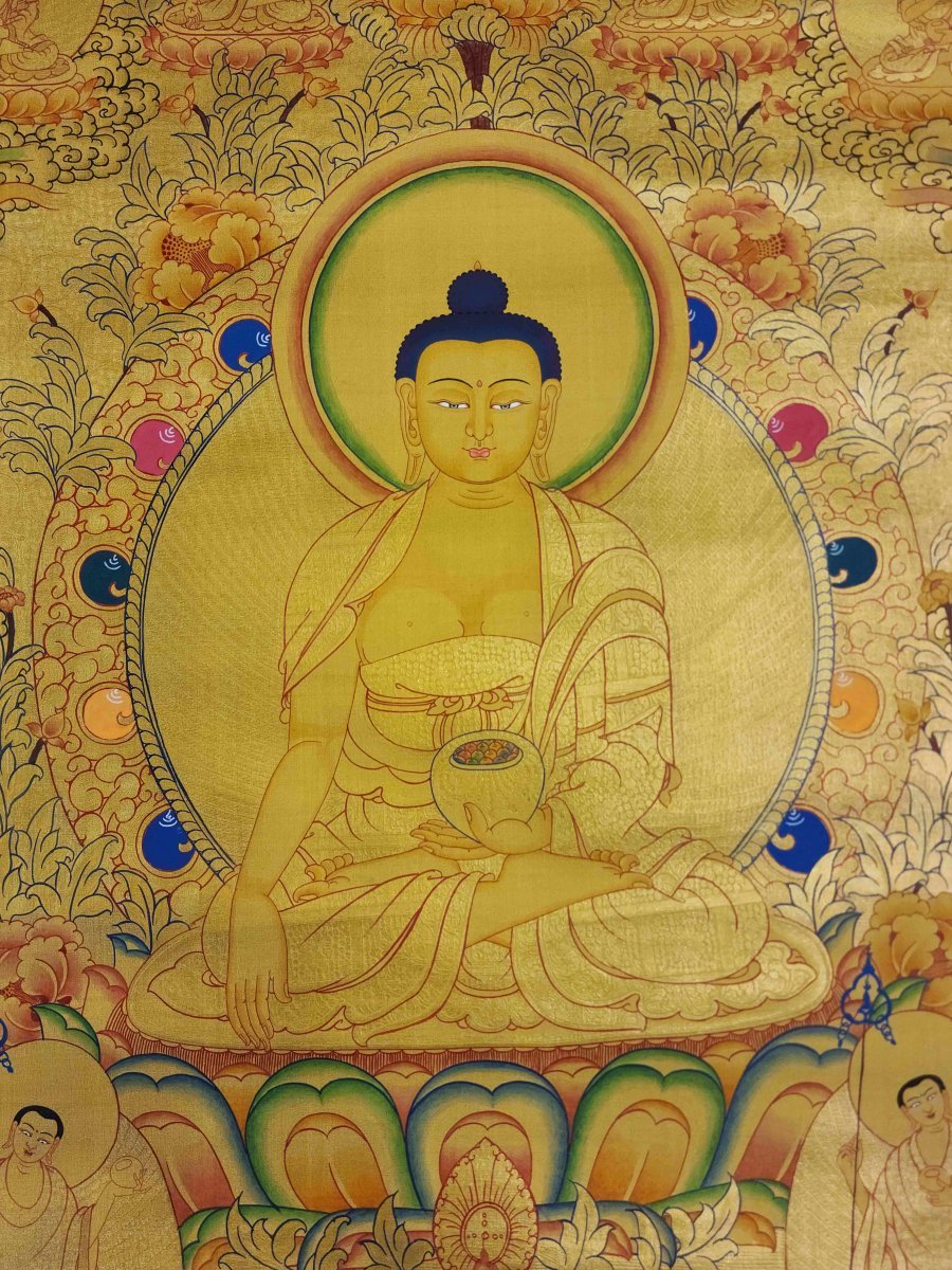 This thangka of Shakyamuni Buddha has real gold painted on its surface along with other paints. This is an ancient process of decorating the thangka in Tibetan Buddhism, Here gold is ground into gold dust, which is then mixed with other undisclosed material to make it paintable on the canvas. this mixture is then mixed with transparent glue and painted on the thangka. Read More