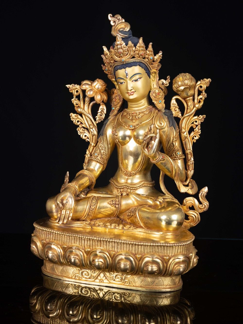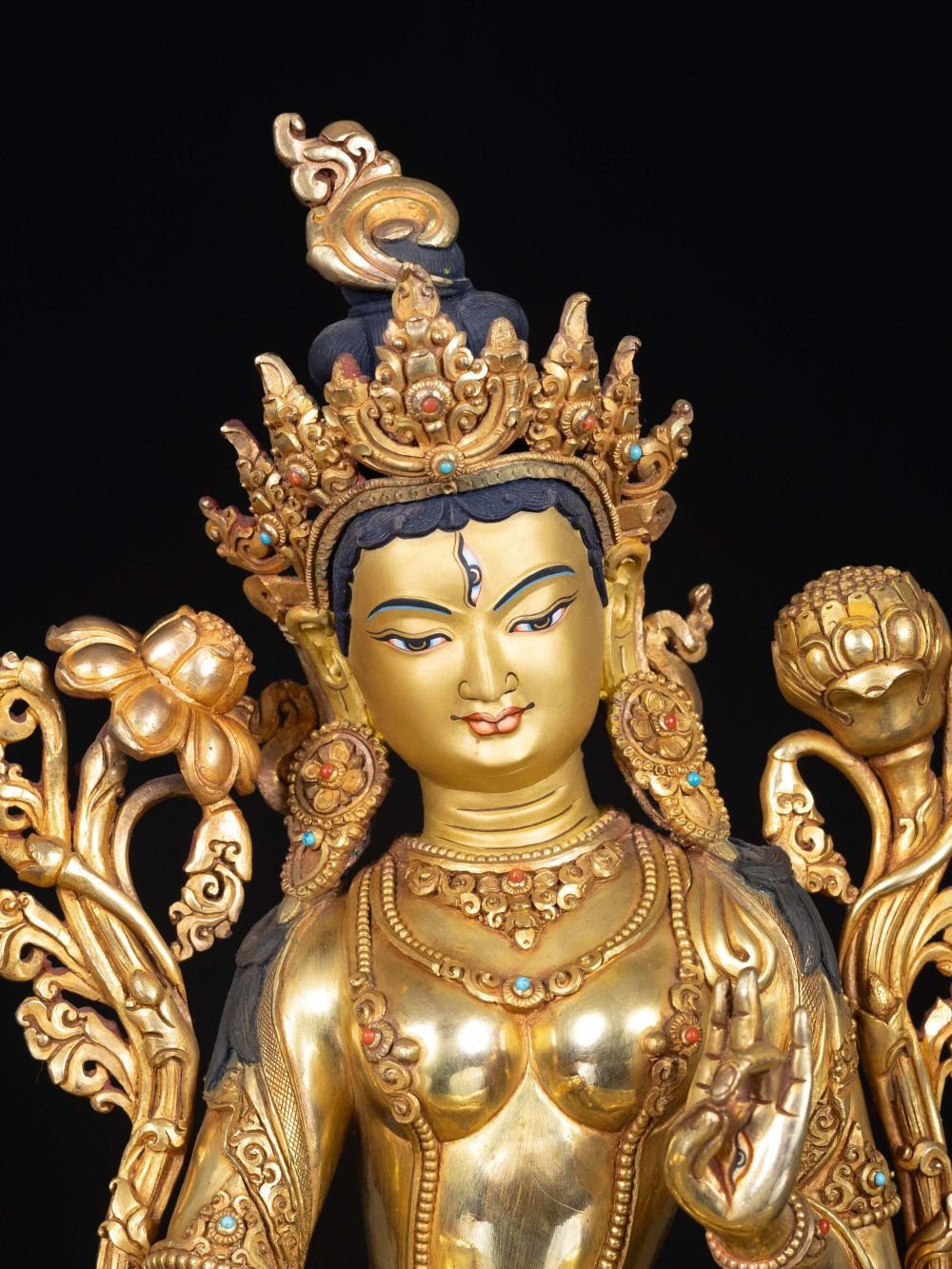 The face of White Tara is painted with gold to enhance its significant features, particularly the eyes, and lips. This detailed painting is essential as it brings forth the crucial attributes of the expression of eyes and lips that metal carving alone cannot capture.