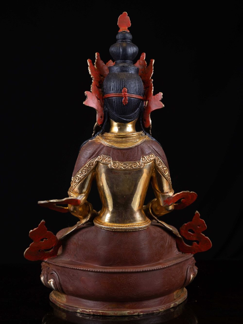 The face of Aparimita is painted with gold to enhance its significant features, particularly the eyes, and lips. This detailed painting is essential as it brings forth the crucial attributes of the expression of eyes and lips that metal carving alone cannot capture.