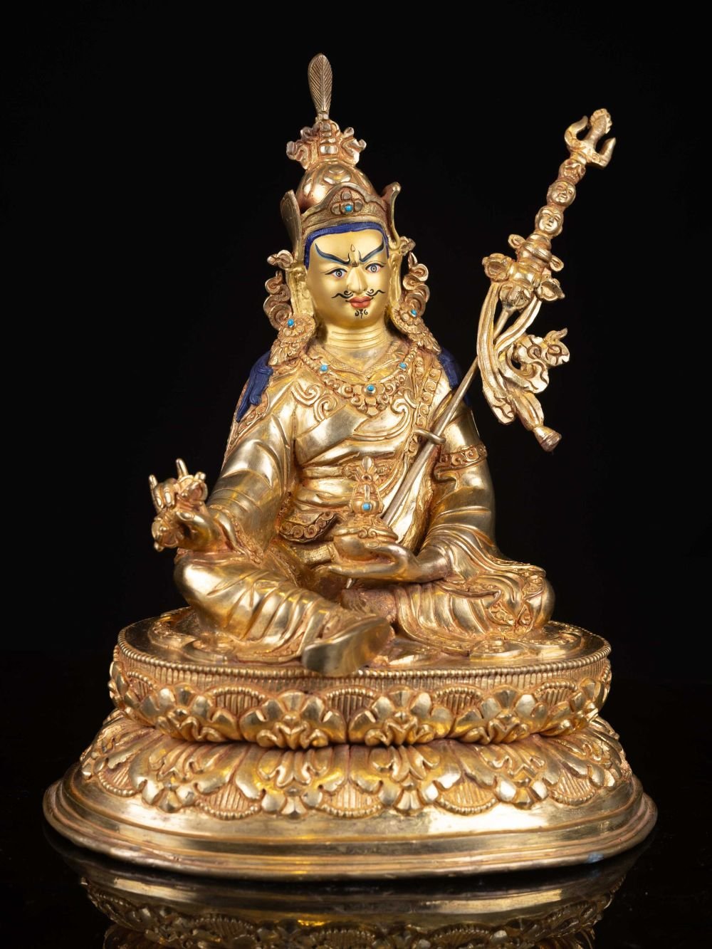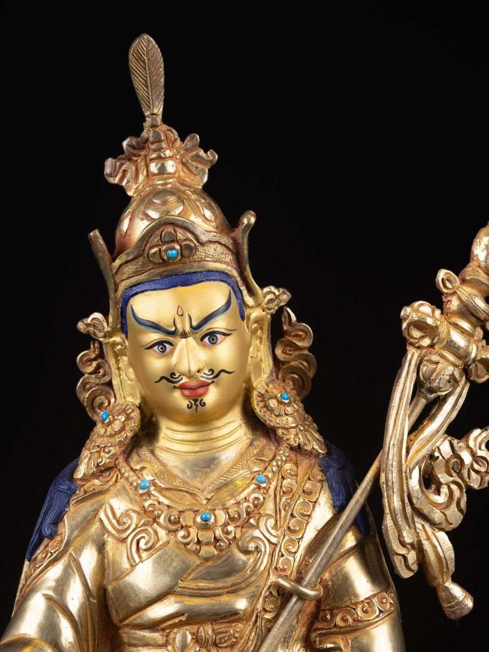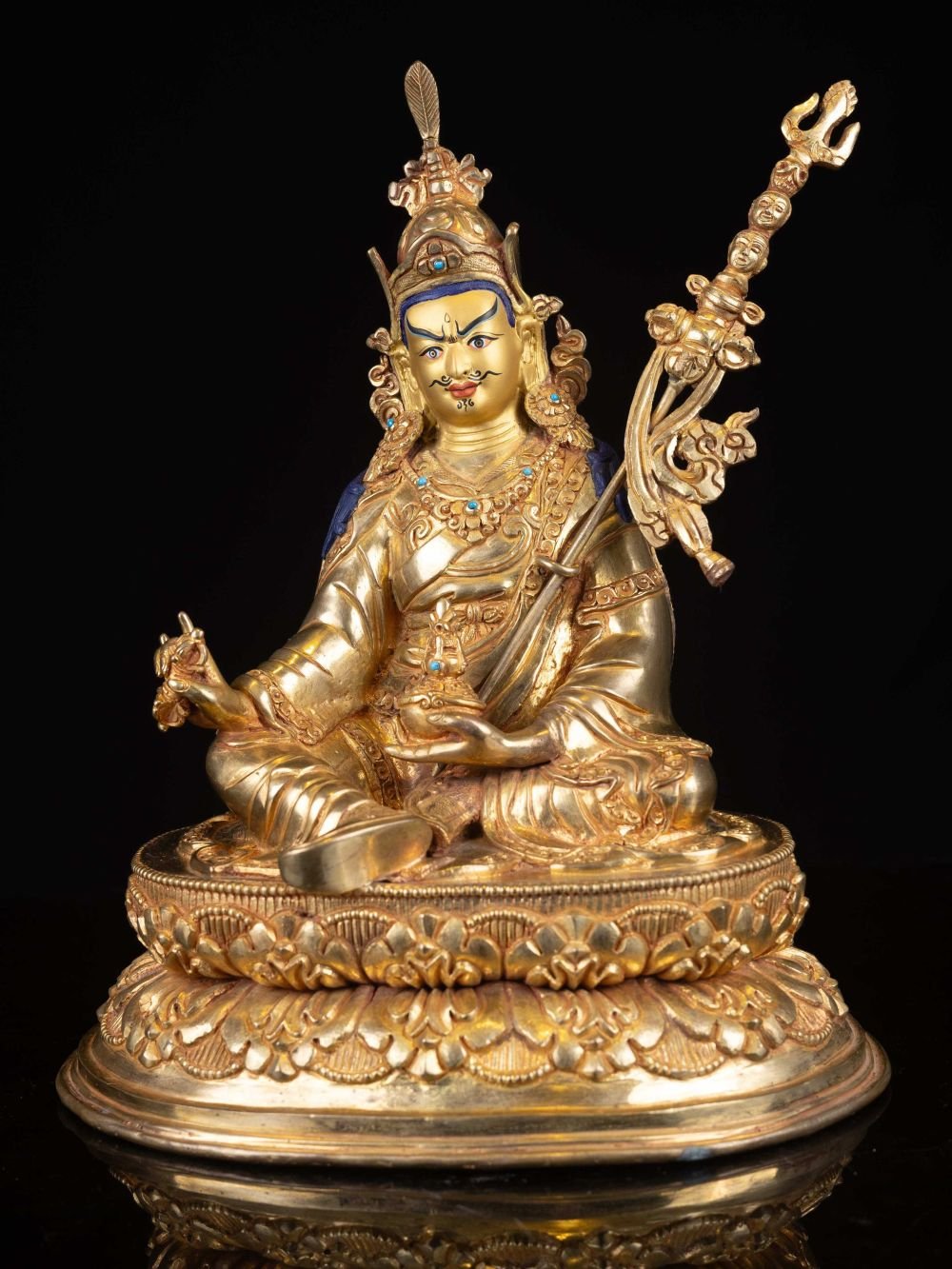 The face of Padmasambhava is painted with gold to enhance its significant features, particularly the eyes, and lips. This detailed painting is essential as it brings forth the crucial attributes of the expression of eyes and lips that metal carving alone cannot capture.