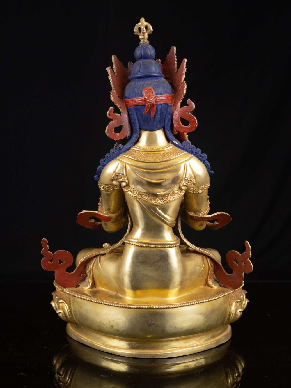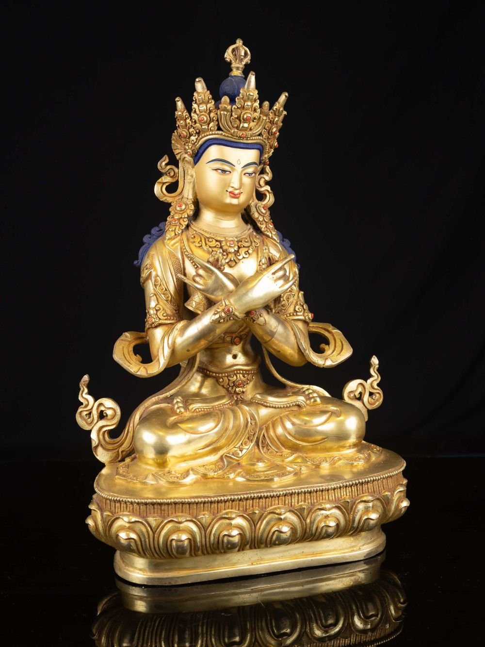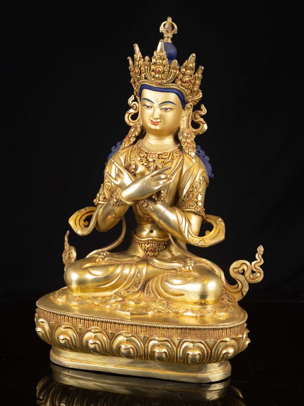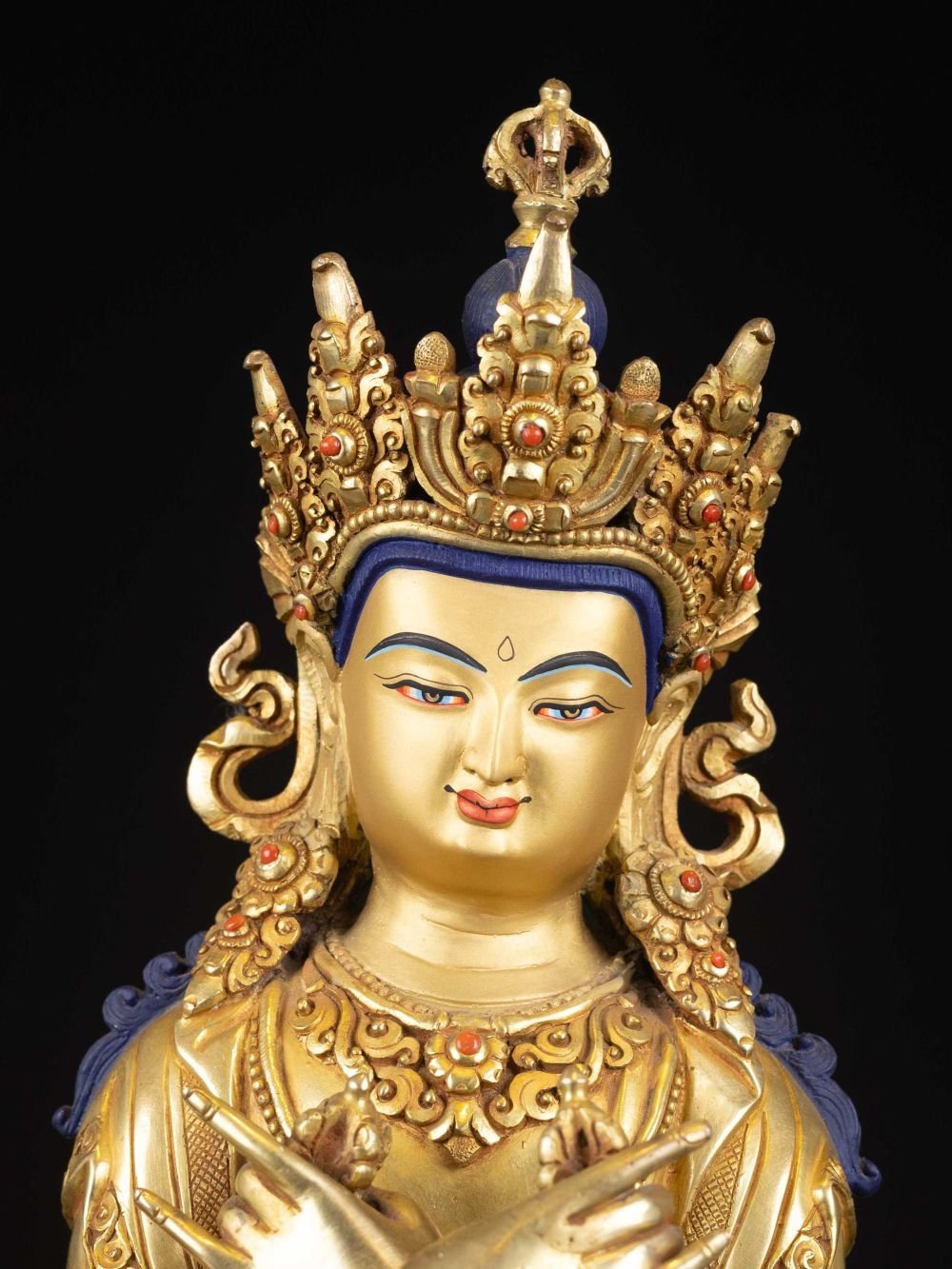 The face of Vajradhara is painted with gold to enhance its significant features, particularly the eyes, and lips. This detailed painting is essential as it brings forth the crucial attributes of the expression of eyes and lips that metal carving alone cannot capture.
