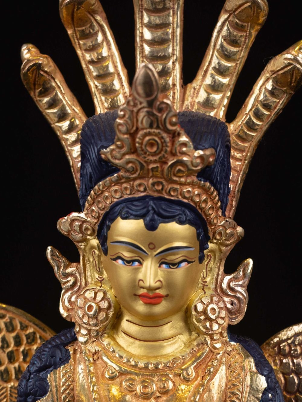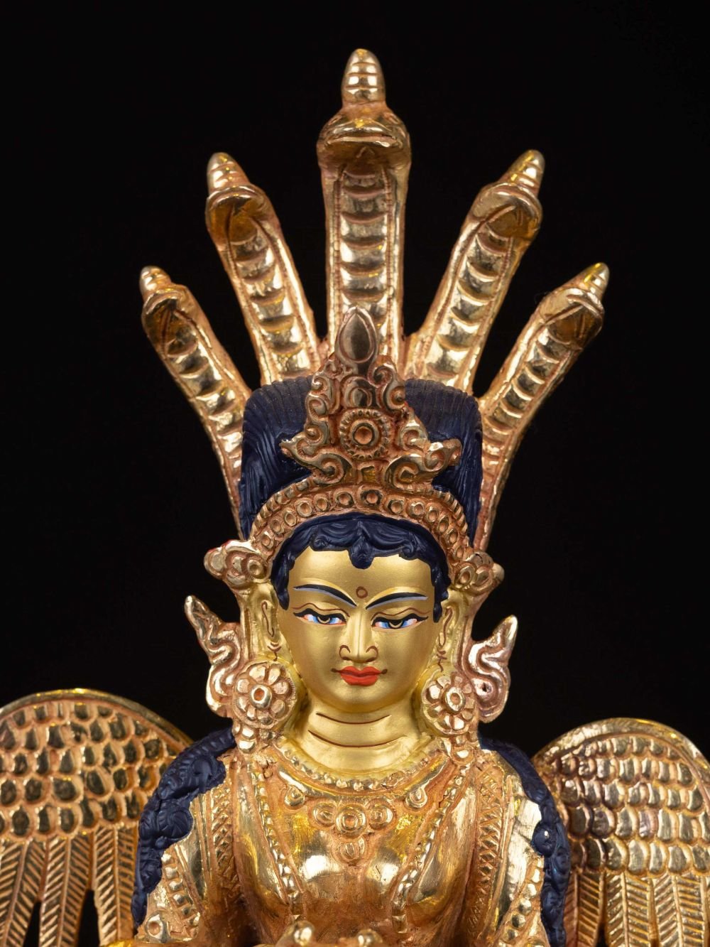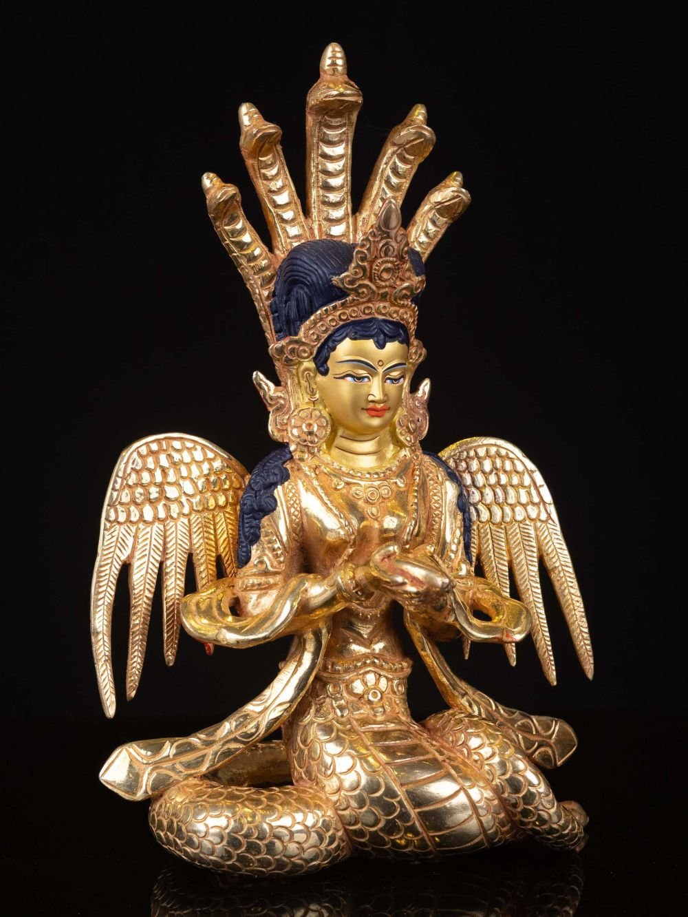This Naga Kanya is finished with full gold plating. also known as mercury gold plating or fire gold plating. This traditional technique involves the application of a genuine layer of gold onto the Naga Kanya. Referred to as mercury gold plating, it is considered the correct and authentic form of gold plating in Nepal. Despite being more expensive than electroplating, this traditional mercury gold plating is gaining popularity again in Nepal. People are drawn to its authenticity, longevity, and the unmatched beauty it brings to the Naga Kanya. The resurgence of interest in this traditional form of gold plating reflects a growing appreciation for the craftsmanship and cultural heritage of Nepal Read More
