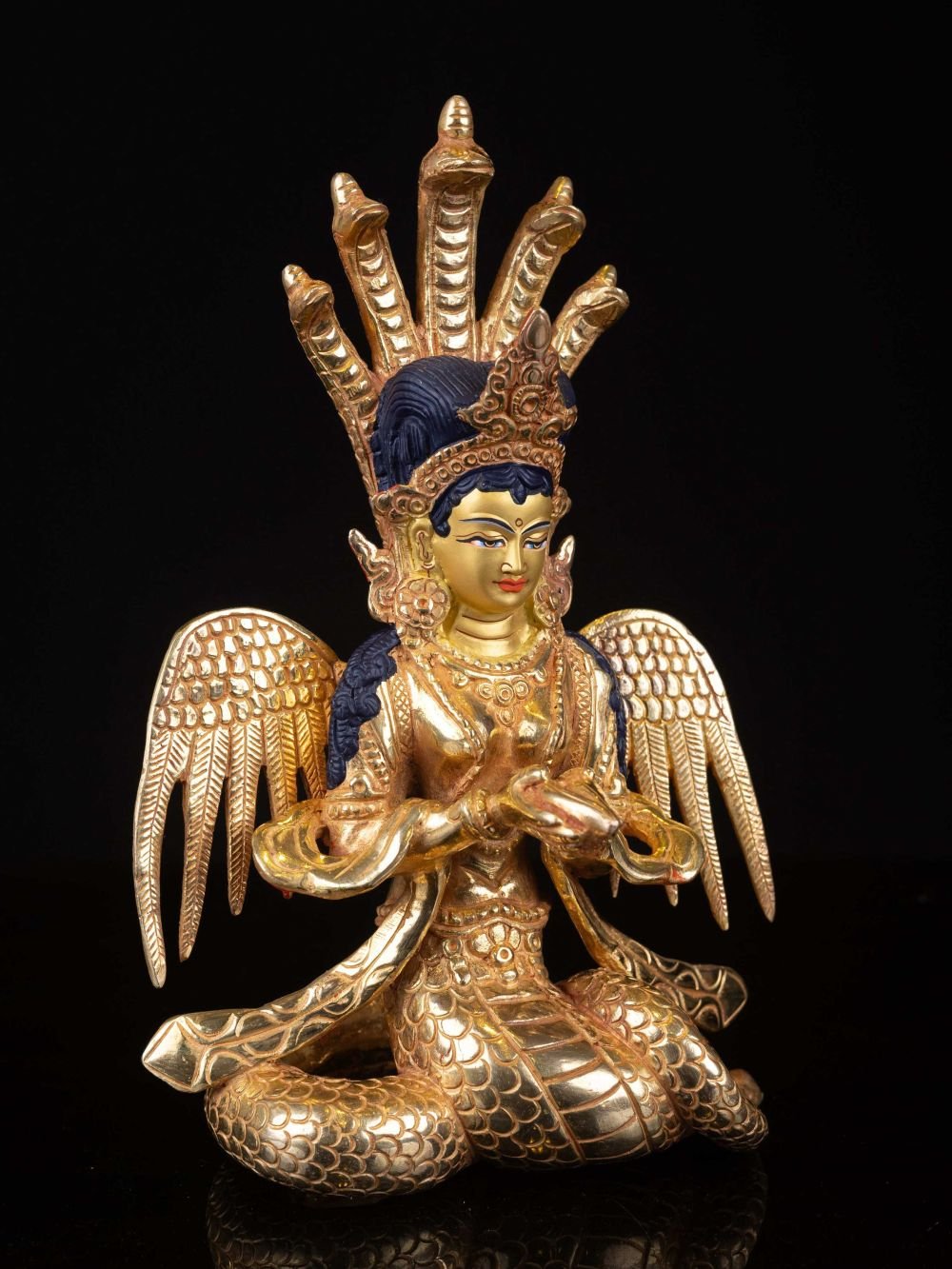 Naga Kanya is usually seen as a very beautiful young girl in sited position, holding precious jewels with her both hand in offering posture, She has 5 headed snake on top of her head as a crown and wings representing she has the ability to fly.