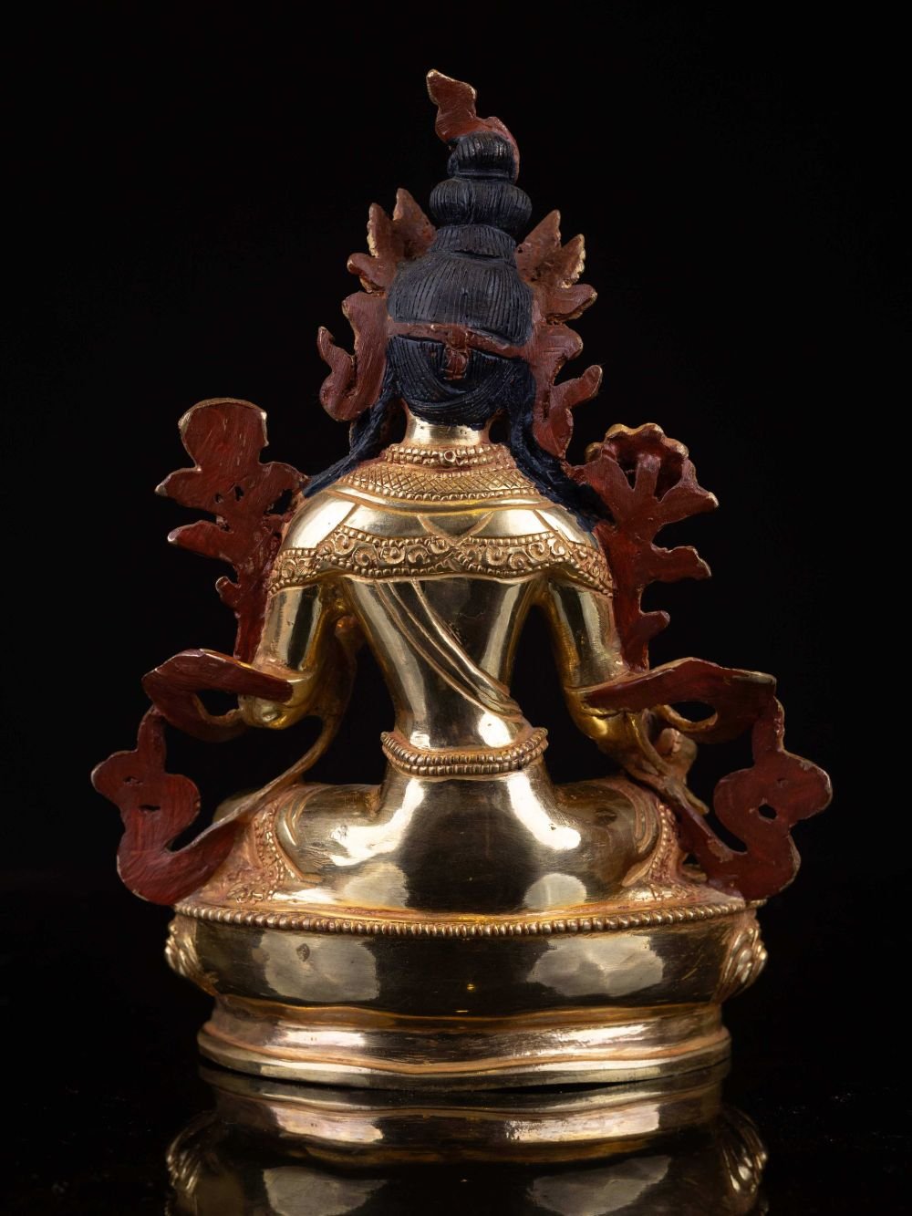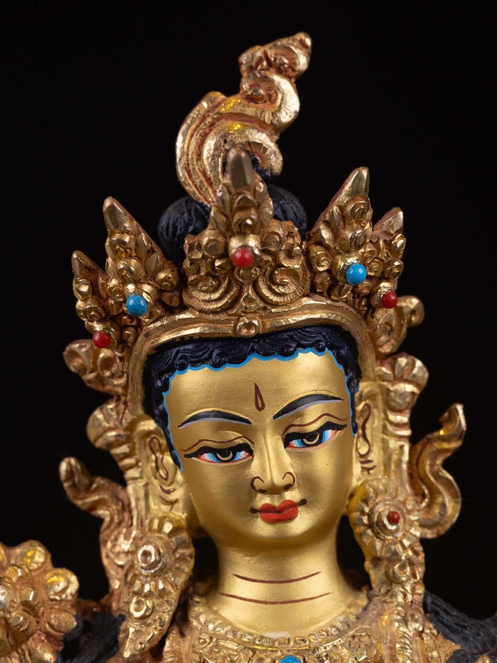 The face of Green Tara is painted with gold to enhance its significant features, particularly the eyes, and lips. This detailed painting is essential as it brings forth the crucial attributes of the expression of eyes and lips that metal carving alone cannot capture.