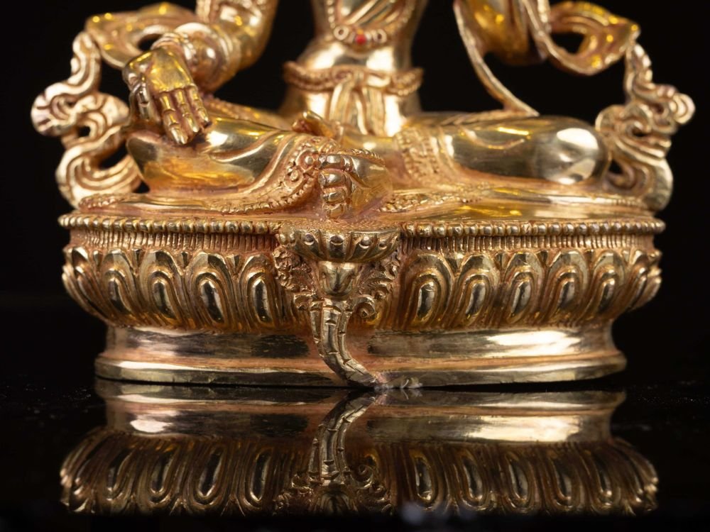 This Green Tara is finished with full gold plating. also known as mercury gold plating or fire gold plating. This traditional technique involves the application of a genuine layer of gold onto the Green Tara. Referred to as mercury gold plating, it is considered the correct and authentic form of gold plating in Nepal. Despite being more expensive than electroplating, this traditional mercury gold plating is gaining popularity again in Nepal. People are drawn to its authenticity, longevity, and the unmatched beauty it brings to the Green Tara. The resurgence of interest in this traditional form of gold plating reflects a growing appreciation for the craftsmanship and cultural heritage of Nepal Read More