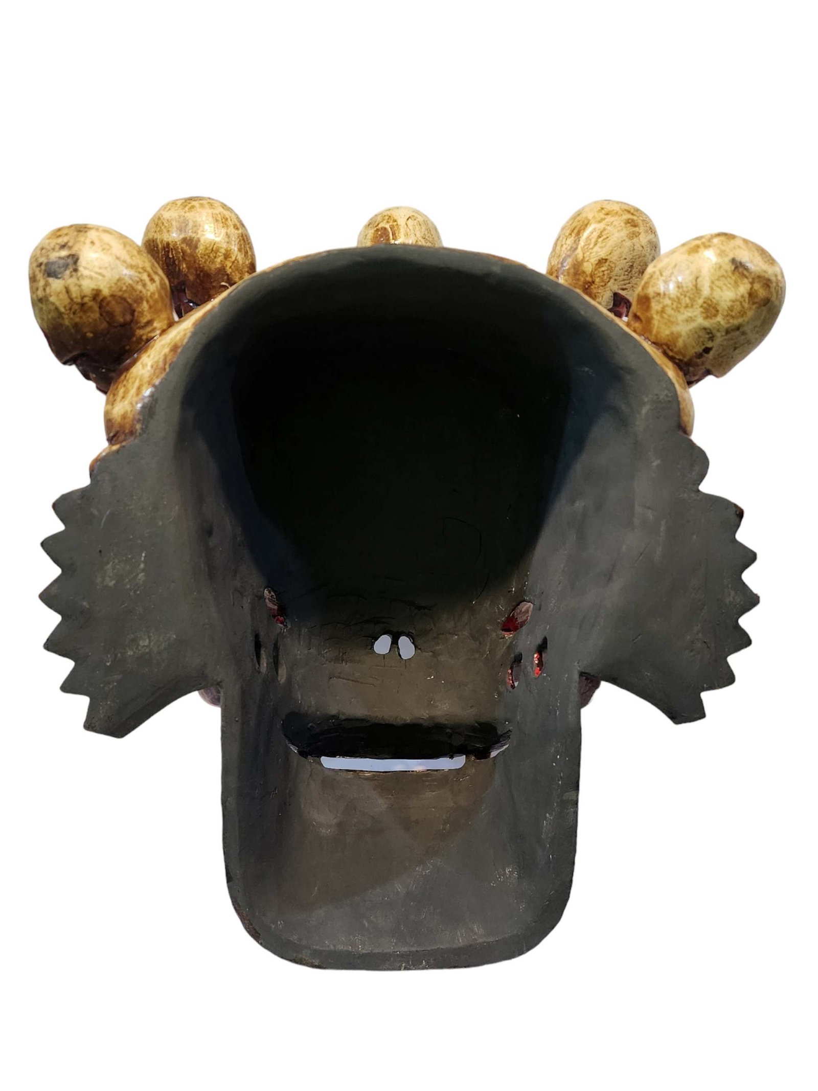 this Citipati mask is Nepali handmade mask and we are Introducing our exquisite collection of Nepali handmade hand-carved wooden Buddhist masks and wall hangings, meticulously crafted by skilled artisans. Each piece in this collection reflects the rich cultural heritage and spiritual significance of Nepal. These masks and wall hangings are not just decorative pieces but hold deep symbolic meaning, making them perfect for adding an authentic touch to your living spaces or meditation rooms. Read More